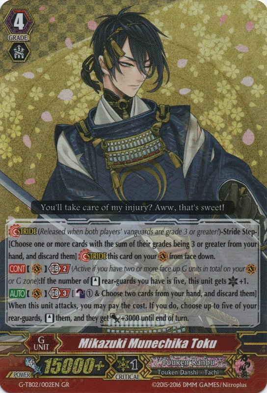 Durch die neuen Karten ist das Deck jetzt auch fähig auf einem kompetitiven Level mitzumischen. Da wäre zum Beispiel der Starter Sayo Samonji Toku, der einer beliebigen Unit +5000 Power und einen extra Critical geben kann. Oder Mikazuki Munechika Toku, der durch seine Effekte einen extra Critical bekommen und auch bis zu fünf Rear Guards standen kann.