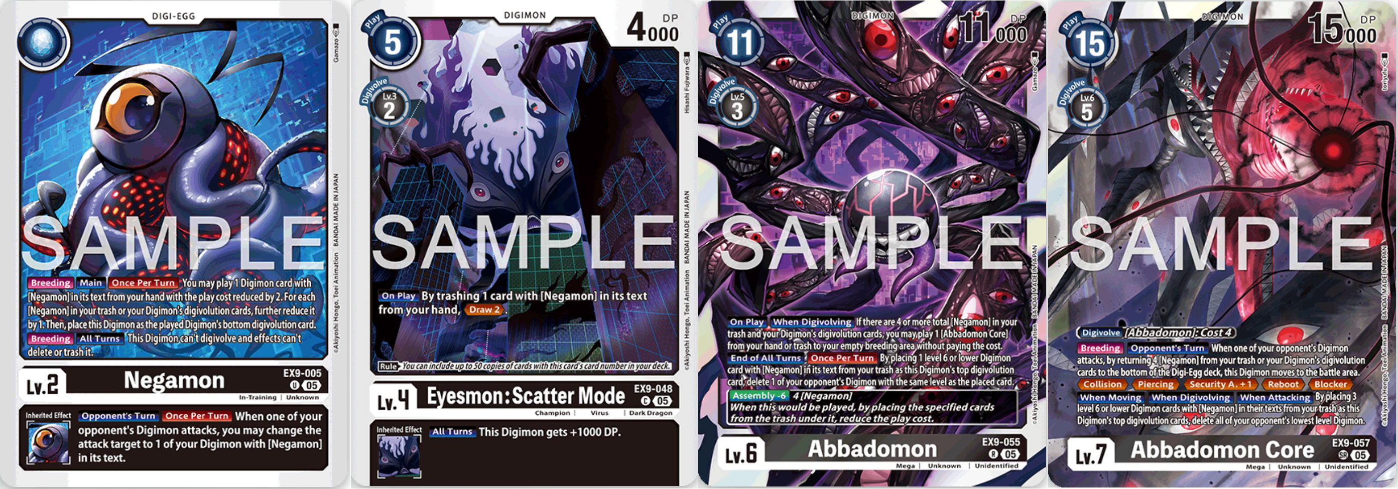 Abbadomon, der finale Gegner von Digimon Adventure: 2020, bekommt ein eigenes, neues Deck passend zu seinem ersten Auftritt im DCG. Das Deck selbst benötigt einiges an Setup und könnte mehr Support vertragen, aber fürs Erste ist es nicht schlecht. Als Digiei gibt es EX9-005 Negamon. Es kann zwar nicht digitieren, aber wenn es in eurer Breeding Area liegt, könnt ihr einmal pro Zug ein Digimon mit Negamon im Kartentext für reduzierte Kosten ausspielen und Negamon als dessen Digitationskarte unterlegen. Dort hat es einen Erbeffekt, welcher euch erlaubt, die Angriffsziele von gegnerischen Digimon auf ein anderes Digimon mit Negamon im Text zu ändern. So muss sich die Gegenseite gut überlegen, ob sie angreift oder nicht. Denn wenn ihr auf stärkere Digimon umlenkt, verliert sie den Kampf. EX9-048 Eyesmon: Scatter Mode könnt ihr bis zu 50x im Deck spielen. Beim Ausspielen könnt ihr eine Karte mit Negamon im Text aus der Hand trashen und dürft dafür zwei Karten ziehen. Da das Deck weniger digitiert als andere, ist Eyesmon euer Schlüssel zum Karten ziehen. Habt ihr mindestens vier Negamon im Trash, könnt ihr das Mega Digimon EX9-055 Abbadomon durch die Assembly Mechanik für Kosten von nur fünf ausspielen. Betritt es das Feld und ihr habt vier oder mehr Negamon im Trash oder in den Digitationskarten eurer Digimon, dürft ihr kostenlos ein Abbadomon Core von der Hand oder aus dem Trash in eure leere Breeding Area legen. Abbadomons DP sind nicht allzu hoch, wodurch es ohne DP Boosts gefährlich wird anzugreifen. Aber am Ende jedes Zuges könnt ihr ein Digimon bis Level 6 mit Negamon im Text vom Trash unter es legen, um ein gegnerisches Digimon mit demselben Level zu zerstören. Daher muss die Gegenseite versuchen, Abbadomon so schnell wie möglich loszuwerden. Euer stärkster Angreifer im Deck ist EX9-057 Abbadomon Core. Befindet es sich in eurer Breeding Area, wenn ein gegnerisches Digimon angreift, könnt ihr vier Negamon vom Trash oder Spielfeld zurück auf euer Digiei Deck legen, um Abbadomon aufs Feld zu bewegen. So habt ihr erneut die Möglichkeit, Negamon zu brüten und günstiger Digimon auszuspielen. Abbadomon Core selbst hat eine Reihe an Effekten: Collision, Piercing, Security Attack +1, Reboot und Blocker. Wird es aufs Spielfeld bewegt, digitiert oder greift an, könnt ihr drei Digimon bis Level 6 mit Negamon im Text vom Trash unter es legen, um alle gegnerischen Digimon mit dem niedrigsten Level zu zerstören. Habt ihr genug im Trash, könnt ihr also die Gegenseite nach und nach räumen.