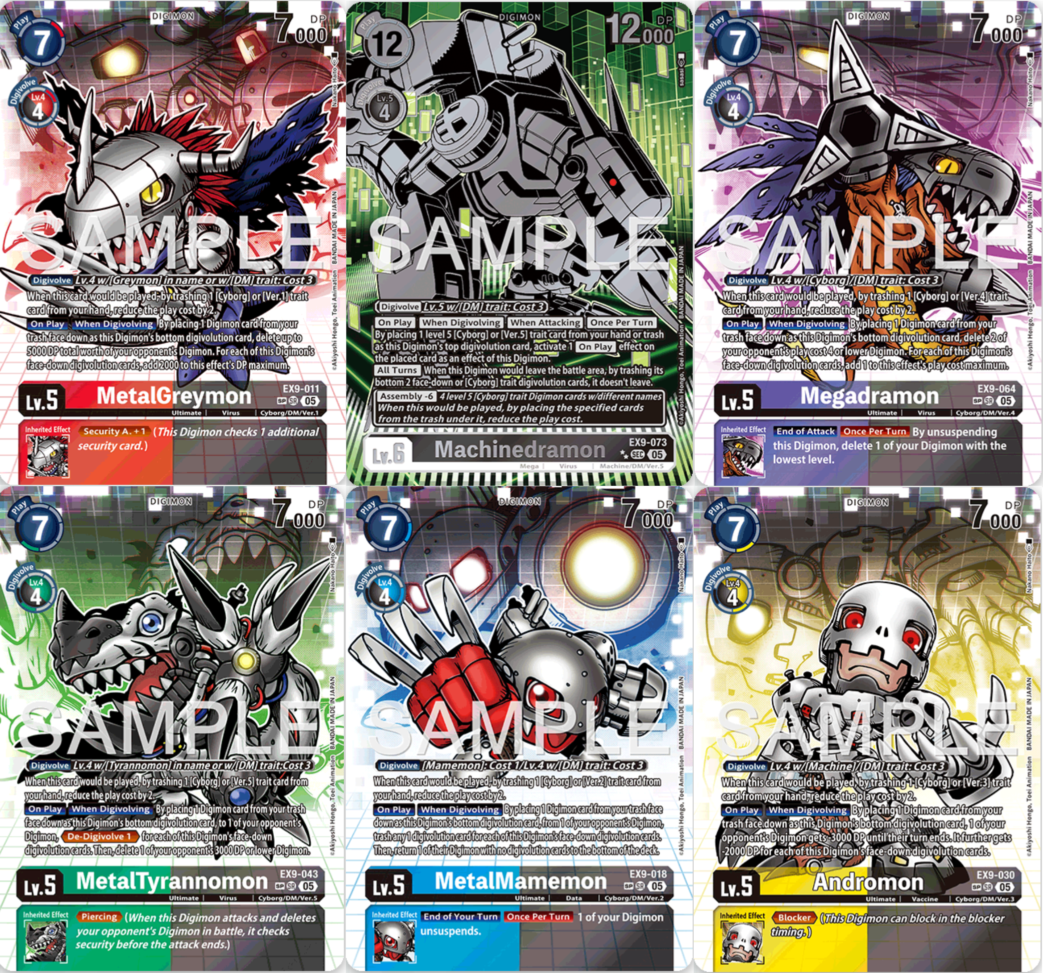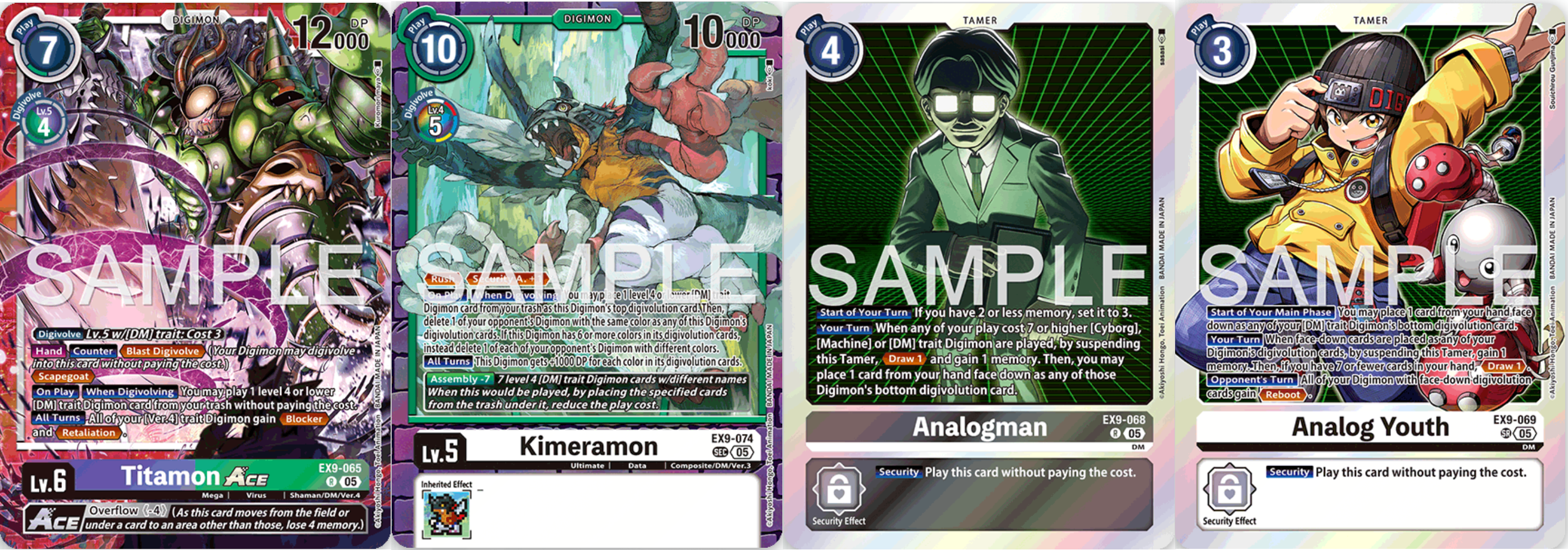 Weiter geht es mit Bossmonstern. EX9-065 Titamon ACE ist der Boss für Ver.4 Decks. Es hat Scapegoat und lässt euch beim Betreten des Feldes ein DM Digimon bis Level 4 kostenlos aus dem Trash holen. All eure Ver.4 Digimon bekommen durch Titamon Blocker und Retaliation. Als allgemeinen Boss gibt es die Secret Rare EX9-074 Kimeramon. Es hat Rush und Security Attack +1. Durch die Assembly Mechanik könnt ihr es für Kosten von drei ausspielen, indem ihr sieben verschiedene Level 4 DM Trait Digimon aus dem Trash unter es legt. Wird es ausgespielt oder digitiert, könnt ihr ein Level 4 DM Trait Digimon vom Trash unter es legen und dürft dann ein gegnerisches Digimon zerstören, welches dieselbe Farbe hat wie eine von Kimeramons Digitationskarten. Hat es mindestens sechs Farben unter sich, dürft ihr stattdessen ein Digimon pro Farbe zerstören. Da die meisten Decks nicht so breit gestreut sind, ist das jedoch nur selten nützlich oder notwendig. Andere Trait Decks wie Adventure oder auch Xros Heart und Blue Flare könnte es unter Umständen böse treffen. Die kommenden Cyber Sleuth Trait Decks ebenso. EX9-068 Analogman ist euer Memory Setter für das Deck. Spielt ihr Cyborg, Maschinen oder DM Digimon mit Kosten von mindestens sieben, könnt ihr ihn suspenden, um eine Karte zu ziehen und ein Memory zu bekommen. Dann dürft ihr eine Karte von der Hand verdeckt unter eines eurer Digimon legen. EX9-069 Analog Youth lässt euch zu Beginn eurer Main Phase immer eine Karte von der Hand unter eure DM Trait Digimon legen. Werden Karten verdeckt unter eure Digimon gelegt, könnt ihr ihn suspenden, um ein Memory zu bekommen und eine Karte zu ziehen, sofern ihr nicht mehr als sieben Handkarten habt. Außerdem verleiht er all euren Digimon mit verdeckten Digitationskarten Reboot.