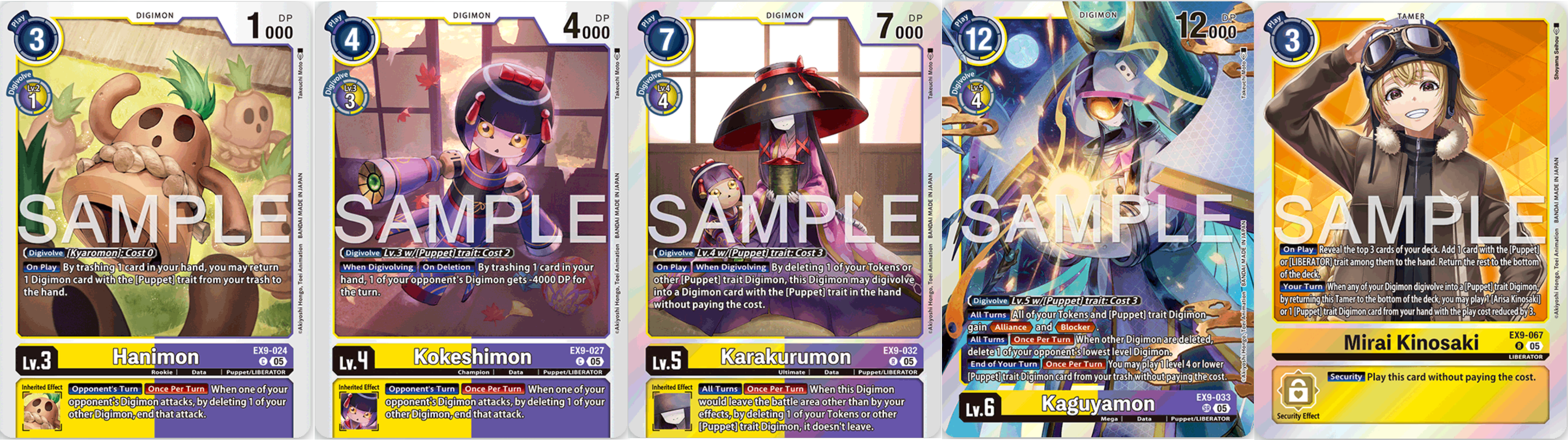 Diese rechteckigen, kastenförmigen Geräte waren (bzw. sind) im Grunde Digimon Tamagotchi. Man konnte Digimon ausbrüten, füttern, pflegen, mit ihnen trainieren usw. Basierend auf den verschiedenen Versionen mit unterschiedlichen Digimon und Designs gibt es nun auch Karten, mit denen man passende Decks zu den VPets bauen kann. Dabei werden von den VPets selbst die Designs in die Kartenränder eingebaut und die Originalsprites ersetzen das Bild in der Box im Erbeffekt, was aus dem Ganzen ein sehr schön vollendetes Gesamtbild kreiert. Die Decks, die man bauen kann, sind nicht an einzelne Farben gebunden, sondern bilden neue Trait Decks. So haben alle zugehörigen Karten den DM Trait (Digital Monster – Name der Geräte) und zusätzlich eine Versionsnummer in Anlehnung an die sechs ursprünglichen VPets (also Ver.1 bis Ver.6). Die meisten Digimon können auf DM Trait Karten digitieren, Effekte beziehen sich aber meist spezifisch auf die Versionsnummern. Dennoch entstehen viele Möglichkeiten, wie wir später kurz zeigen. Abgesehen davon enthält EX9 das Bossmonster für das Wind Guardian Feld Deck, Adventure Deck Support, ein neues Deck für den Endboss von Digimon Adventure: 2020 (Abbadomon) und den letzten Liberator Charakter, der (neben Unchained) noch gefehlt hat: Mirai Kinosaki. Sie ist Arisas ältere Schwester und ihre Karten supporten Arisas Puppen Deck. Die neue Digitationslinie zeigt wieder einmal, wie gut Digimon reale Vorbilder umsetzt und verknüpft. So bildet die Linie einen Bogen von alt zu neu. Mit dem Rookie Hanimon, welches eine Haniwa Lehmpuppe (frühere Grabbeigabe) darstellt, zu Kokeshimon – eine traditionelle japanische Holzpuppe – zu Karakurumon, welches eine gruselige Karakuri Puppe darstellt, zum Mega Level Kaguyamon, welche eine futuristische, mechanische Puppe mit Bambus Raketen, welche auf die Kaguya-hime Legende verweist. Eine rundum gelungene Digitationslinie und starker Support für Arisa.