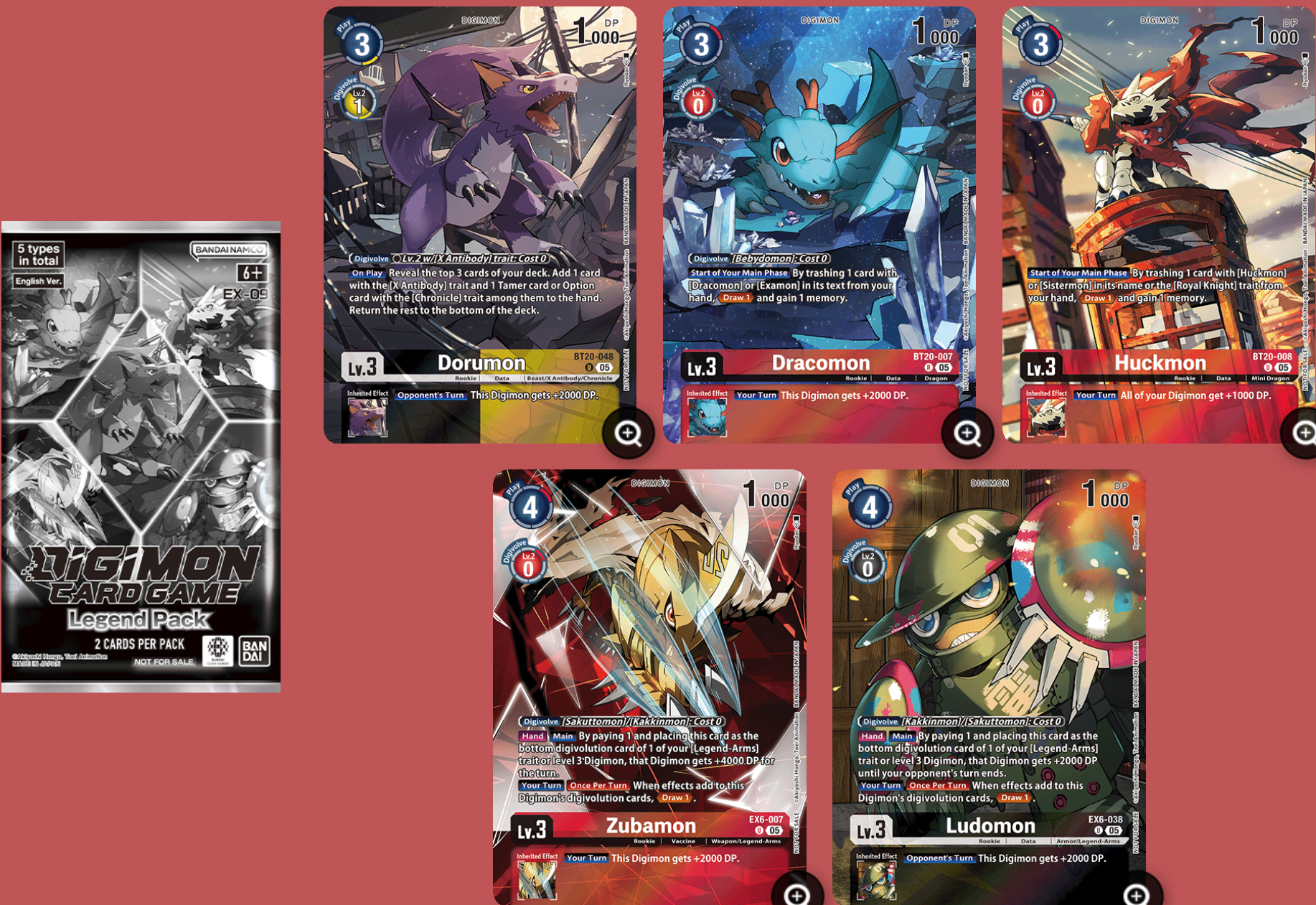 Jedes Display von EX9 enthält ein „Legend Pack“ Boxtopper Pack mit zwei von fünf Alternative Art Karten aus BT20 – Over the X und EX6 – Infernal Ascension. Dabei handelt es sich um EX6-007 Zubamon und EX6-038 Ludomon sowie um BT20-008 Huckmon, BT20-007 Dracomon und BT20-048 Dorumon. Die Effekte unterscheiden sich wie üblich nicht, die Karten haben nur andere Designs.