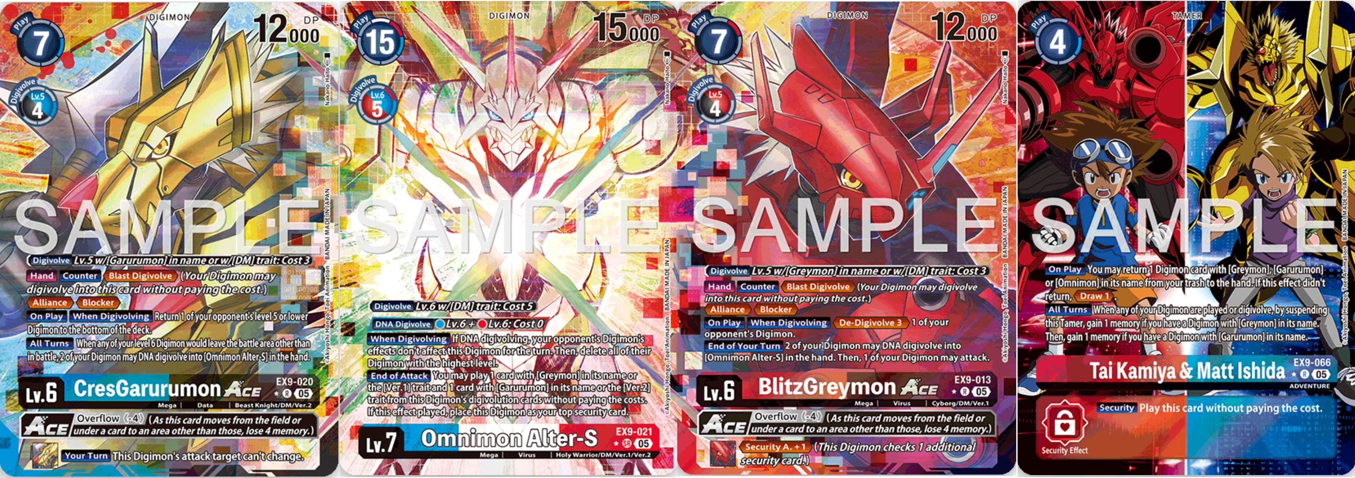 Hinter dem Titel verstecken sich eigentlich Omnimon bzw. DM / Ver.1/Ver.2 Support. Die Karten können theoretisch in allen entsprechenden Decks gespielt werden. EX9-013 BlitzGreymon ACE hat Alliance und Blocker. Betritt es das Feld, löst es De-Digivolve 3 auf ein gegnerisches Digimon aus. Am Ende eures Zuges können zwei eurer Digimon zu Omnimon Alter-S in eurer Hand digitieren und eines eurer Digimon kann angreifen – auch, wenn euer Zug durch die DNA-Digitation beendet wird. Als Erbeffekt verleiht es zudem Security Attack +1. EX9-020 CresGarurumon ACE hat ebenfalls Alliance und Blocker und schickt ein gegnerisches Digimon bis Level 5 unters Deck, wenn es das Feld betritt. Zudem kann es verhindern, dass eure Level 6 Digimon vom Feld geschickt werden und lässt euch stattdessen zu Omnimon Alter-S digitieren. Sein Erbeffekt verhindert, dass eure Angriffsziele geändert werden. EX9-021 Omnimon Alter-S selbst kann aus blauen und roten Level 6 Digimon DNA digitieren. Wurde es so aufs Feld gerufen, ist es für den Zug immun gegen sämtliche Effekte der Gegenseite. Ist eure Security gefährdet, könnt ihr nach einem Angriff mit Omnimon je ein Greymon / Ver.1 und Garurumon / Ver.2 aus seinen Digitationskarten ausspielen und Omnimon auf eure Security legen, wo es eine Barriere mit 15000DP bildet. Als weitere Verstärkung gibt es EX9-066 Tai & Matt. Der Doppeltamer kann euch beim Ausspielen Greymon, Garurumon oder Omnimon Karten aus dem Trash holen oder zumindest eine Karte ziehen lassen, wenn ihr nichts aus dem Trash braucht. Spielt ihr Digimon oder digitiert, könnt ihr ihn suspenden, um ein Memory für eine Greymon und ein weiteres für eine Garurumon Karte zu bekommen. Weitere Verwendungsmöglichkeiten könnten die Karten in Kombination mit alten Omnimon Karten und den kommenden Karten aus BT22 – Cyber Eden sehen.