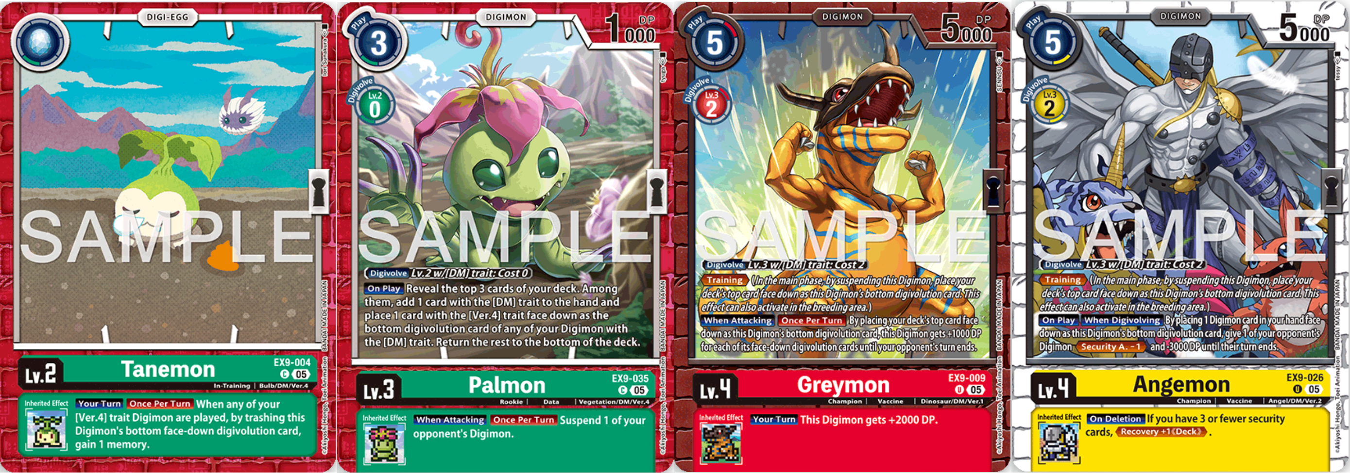 Wie eingangs erwähnt, machen die Karten der verschiedenen VPet Decks unterschiedliche Dinge. EX9-004 Tanemon hilft als Digiei zum Beispiel bei der Kontrolle eurer Memory, indem ihr eine Digitationskarte zerstört, wenn ihr ein Ver.4 Digimon spielt. EX9-035 Palmon ist euer Sucher für DM Trait Karten und kann Ver.4 Digimon unter eure Digimon legen. Als Erbeffekt suspended es außerdem gegnerische Digimon. EX9-009 Greymon hat den neuen Training-Effekt. Dieser erlaubt euch, das Digimon mit Training zu suspenden, um so die oberste Karte eures Decks verdeckt unter es zu legen. Beim Angreifen kann es ebenfalls so eine Karte unter sich geben und bekommt dann pro verdeckter Digitationskarte zusätzliche 1000DP. EX9-026 Angemon hat ebenfalls Training und ihr könnt, wenn es das Feld betritt, eine Handkarte verdeckt unter es legen, um einem gegnerischen Digimon temporär 3000DP abzuziehen und ihm Security Attack -1 zu verpassen. Alle Digimon dieser Art machen unterschiedliche Dinge, die teils zu ihren Farben zugeordnet werden können. Der Nachteil von Training ist vor allem, dass ihr keine Erbeffekte durch die verdeckten Karten nutzen könnt und De-Digivolve sehr gefährlich ist, da es euren ganzen Stack zerstören kann. Ihr dürft euch eure eigenen verdeckten Digitationskarten laut Regelwerk aber zumindest ansehen, damit ihr wisst, welche Karten ihr an die Mechanik verloren habt.