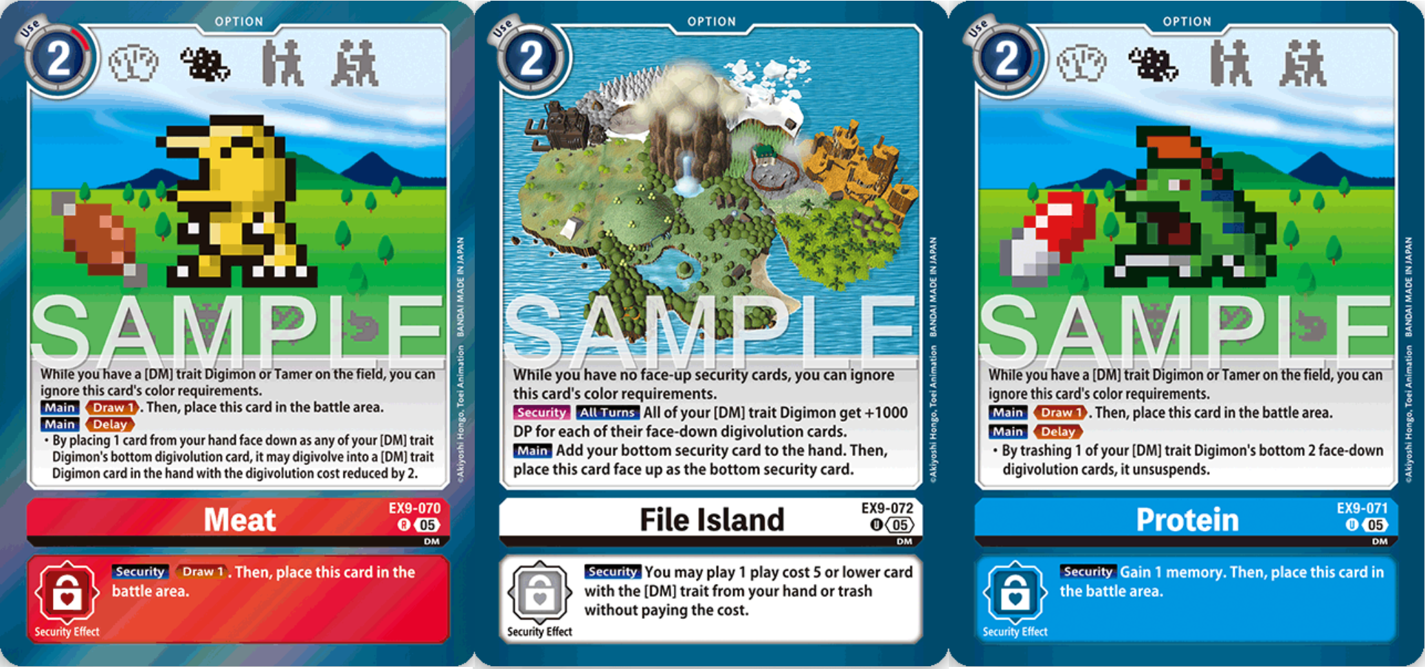 Für die Decks gibt es außerdem ein paar Option Karten. EX9-070 Meat lässt euch beim Ausspielen eine Karte ziehen und legt sich für einen Delay-Effekt auf euer Spielfeld. Löst ihr den Delay, könnt ihr eine Handkarte verdeckt unter eines eurer DM Trait Digimon legen und es darf dann für reduzierte Kosten digitieren. EX9-071 Protein funktioniert genauso, lässt euch durch den Delay aber zwei verdeckte Digitationskarten eines eurer DM Digimon zerstören, um dieses zu unsuspenden, wodurch ihr erneut angreifen könnt oder einen Blocker bereit habt. Die nostalgische EX9-072 File Island ist der traiteigene Feldzauber. Spielt ihr sie aus, nehmt ihr eure unterste Security auf die Hand und legt File Island offen an deren Stelle. Dort gibt es euren DM Trait Digimon zusätzliche 1000DP für jede ihrer verdeckten Digitationskarten. Wird die Karte in der Security zerstört, könnt ihr ein DM Digimon mit Kosten bis fünf kostenlos aus dem Trash spielen. Die hier gezeigten Karten waren nur ein kleiner Teil der DM Trait Karten aus dem Set. Wie ihr seht, bieten sie viele verschiedene Möglichkeiten. Ihr könnt also wild ausprobieren, um eine Version zu finden, die euch gefällt und spielerisch funktioniert.