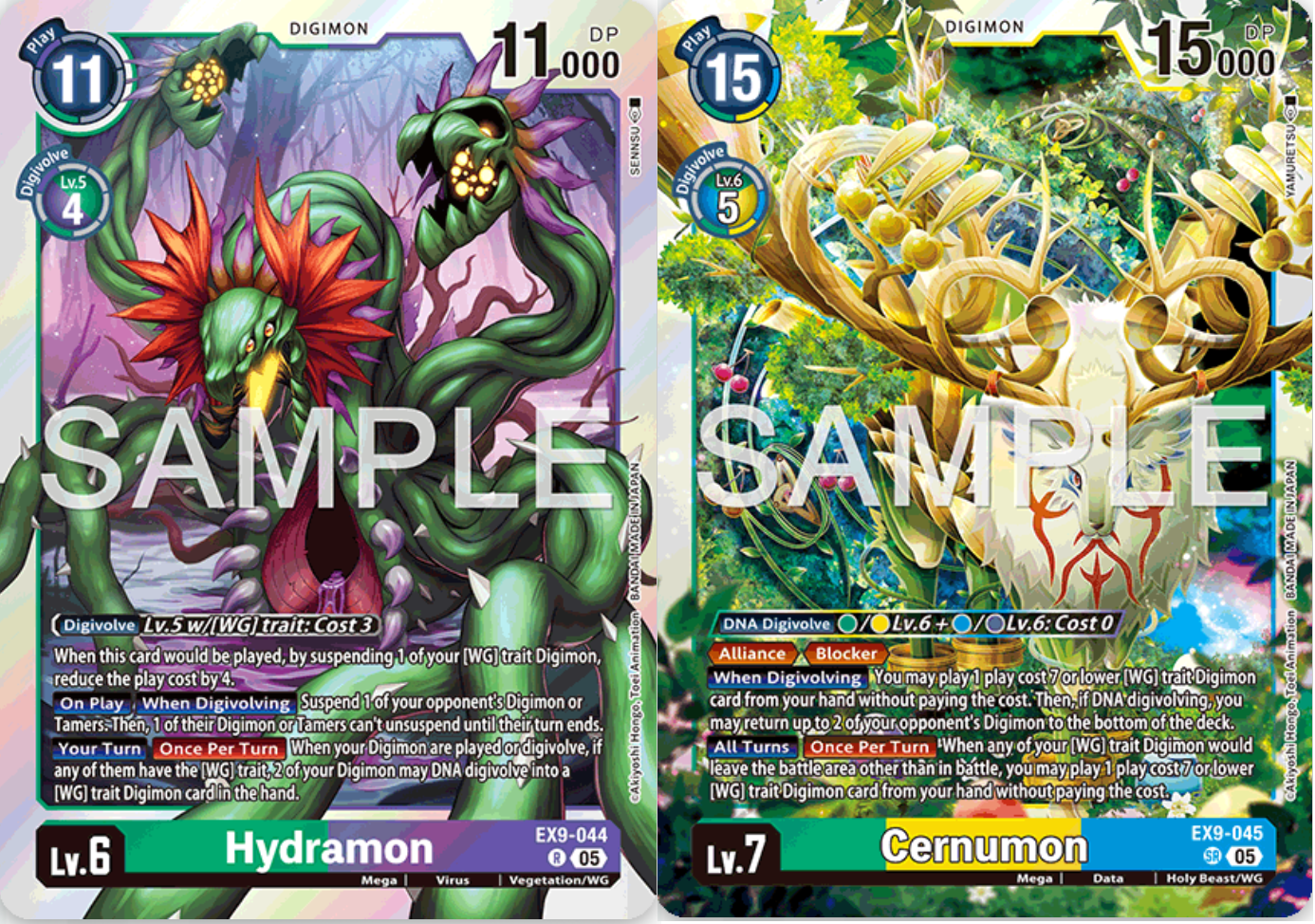 Die Wind Guardians bekommen ein neues EX9-044 Hydramon! Dieses könnt ihr für Kosten von sieben ausspielen, wenn ihr einen Wind Guardian auf dem Feld suspended. Betritt es das Feld, suspended es ein gegnerisches Digimon oder einen Tamer und eine solche Karte kann im Folgezug nicht unsuspenden. Spielt oder digitiert ihr Wind Guardians, erlaubt euch Hydramon eine DNA-Digitation durchzuführen. Bossmonster EX9-045 Cernumon kann aus einem grünen oder gelben Digimon und einem blauen oder violetten Digimon DNA digitieren und lässt euch beim Digitieren kostenlos einen Wind Guardian bis Kosten von sieben ausspielen. Daraufhin schickt es zwei gegnerische Digimon unters Deck zurück, wodurch ihr euch einen Vorteil verschaffen und tendenziell nervige Digimon loswerden könnt. Es hat zudem Alliance, Blocker und hilft euch Wind Guardians kostenlos aufs Feld zu spammen. Die Wind Guardians wirken nach wie vor nicht so mächtig wie andere Feldgruppen Decks, aber mit den neuen Karten kann man das Deck zumindest spielen.