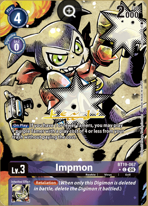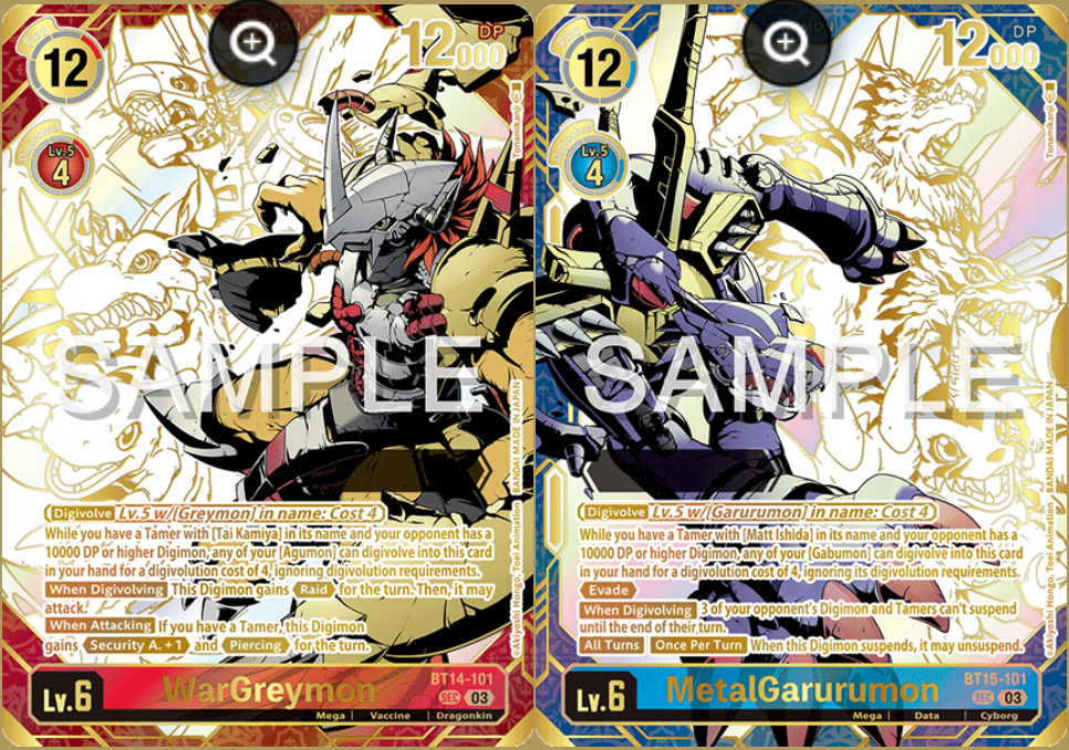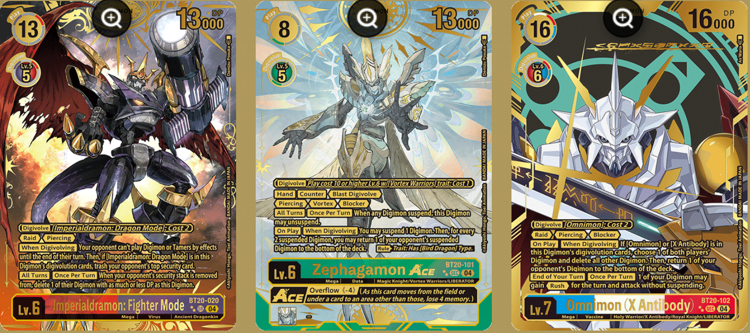 Für die Glücklichsten unter uns besteht die Möglichkeit, spezielle Alt Arts mit sehr niedriger Pullrate zu ziehen. Dabei gibt es Special Rare Versionen der BT19 und 20 ACE Karten, eine goldene Version von Imperialdramon: Fighter Mode, Zephagamon ACE und Omnimon X, eine signierte Alt Art von Impmon, welche mit dem signierten Guilmon aus Special Booster 2.0 ein Portrait ergibt und nummerierte Alt Art Versionen der Secret Rares zu BT14 WarGreymon und BT15 MetalGarurumon.