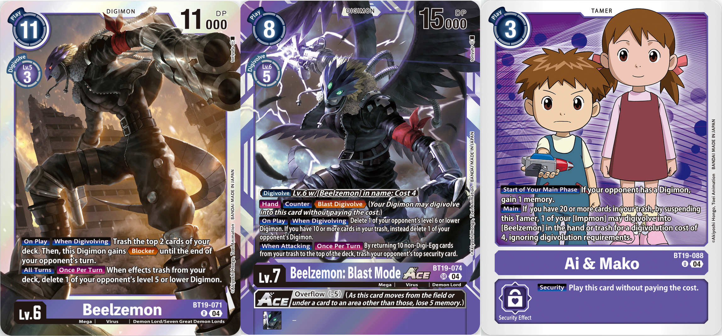Keine vollständige Reihe, aber ein paar neue, starke Karten gibt es auch für Beelzemon. BT19-088 Ai & Mako sind generische Memory Tamer und lassen eure Impmon für Kosten von vier zu Beelzemon aus Hand oder Trash warpen, sofern ihr 20 oder mehr Karten im Trash habt. Schwer zu erfüllen ist diese Bedingung nicht und reduziert auch potenziell die Anzahl an Champion und Ultra Digimon, die ihr fürs Deck braucht, da ihr diese einfach überspringen könnt. Das neue BT19-071 Beelzemon lässt euch zwei Karten trashen und bekommt temporär Blocker. Werden Karten vom Deck getrashed, kann es einmal pro Zug ein gegnerisches Digimon bis Level 5 zerstören. Zwar ist dieser Effekt nett, aber insgesamt sind die meisten anderen Beelzemon nützlicher. Mit BT19-074 Beelzemon: Blast Mode ACE bekommt das Deck (und allgemein violette Decks) aber ein Level 7 ACE Digimon. Beim Betreten des Feldes zerstört es ein Level 6 Digimon – oder Level 7, wenn ihr mindestens zehn Karten im Trash habt – und beim Angreifen könnt ihr zehn Karten vom Trash auf euer Deck legen, um die oberste gegnerische Security Karte zu trashen. Es ist also ein relativ generischer Zerstörer und hilft dabei, ein Deck Out zu verhindern!