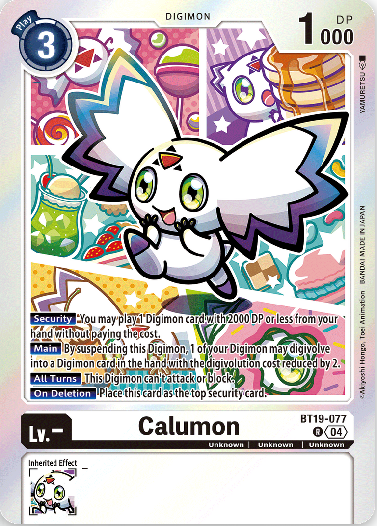 Während das alte Calumon aus EX2 – Digital Hazard dabei geholfen hat, bei Digitationen eine Karte mehr zu ziehen und euren Digimon ein kleines Powerup zu verpassen, wird das neue BT19-077 Calumon seiner Rolle als Licht der Digitation viel eher gerecht. Wird Calumon zerstört, legt es sich selbst auf eure Security. Wird es dann in der Security gechecked, lässt es euch kostenlos ein Digimon bis 2000DP von der Hand spielen. Sein Licht der Digitation äußert sich zudem in seinem Haupteffekt, wodurch ihr es suspenden könnt, um eines eurer Digimon für reduzierte Kosten zu digitieren. Theoretisch kann man Calumon in jedes Deck einbauen, welches häufig Digitation nutzt. Zudem kann es auch nicht von gegnerischen Effekten getroffen werden, welche sich auf Level beziehen, da es keines hat. Da es allerdings nicht angreifen oder blocken kann, müsst ihr überlegen, ob der Platz im Deck vorhanden ist oder anderweitig genutzt werden sollte.