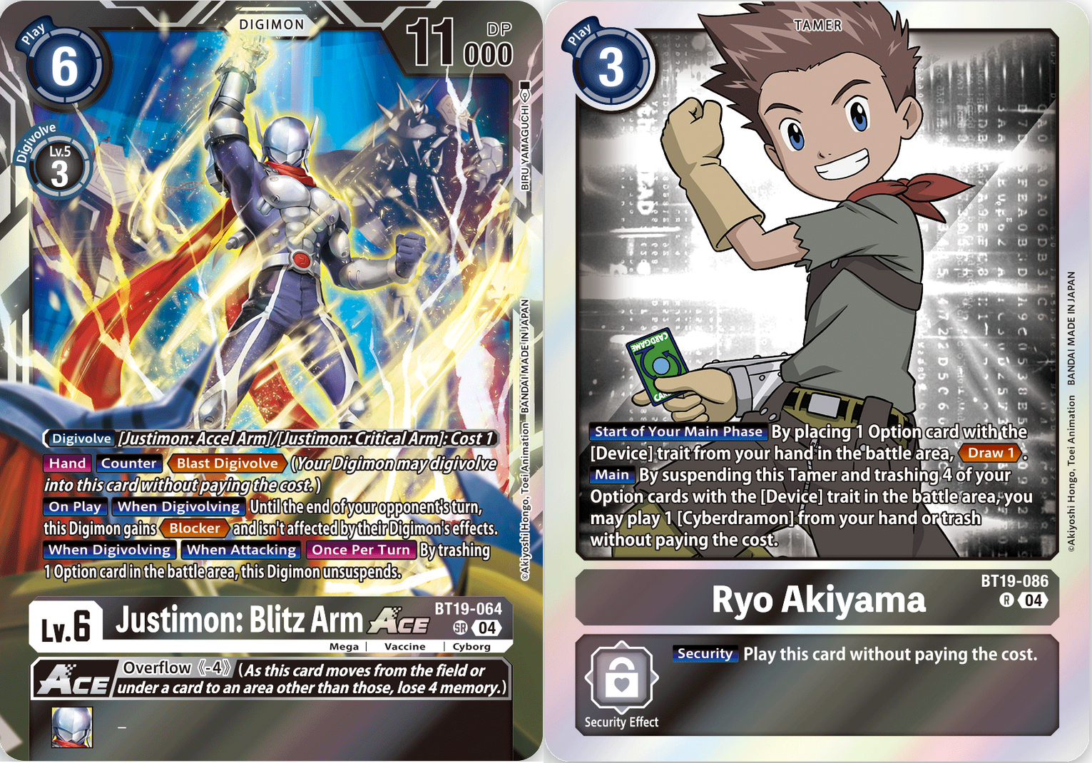 In EX8 – Chains of Liberation und über Promo Packs gab es bereits Spielfiguren für das neue Ryo und Justimon Deck. Das neue Set vervollständigt dieses. BT19-064 Justimon: Blitz Arm ACE bekommt beim Betreten des Feldes temporär Blocker und kann nicht von den Effekten gegnerischer Digimon betroffen werden. Beim Digitieren und Angreifen kann es eine Option Karte auf dem Spielfeld zerstören und sich so unsuspenden. BT19-086 Ryo Akiyama lässt euch zu Beginn der Main Phase eine Device Option Karte von der Hand aufs Feld legen und so eine Karte ziehen. Suspendet ihr ihn und zerstört vier Device Karten auf dem Feld, könnt ihr Cyberdramon kostenlos von der Hand oder dem Trash spielen. In Kombination mit den diversen Device Karten, deren Motive und Namen auf Schachfiguren basieren, und den X Antibody Formen der Reihe bietet das Deck eine ganz neue Strategie an.