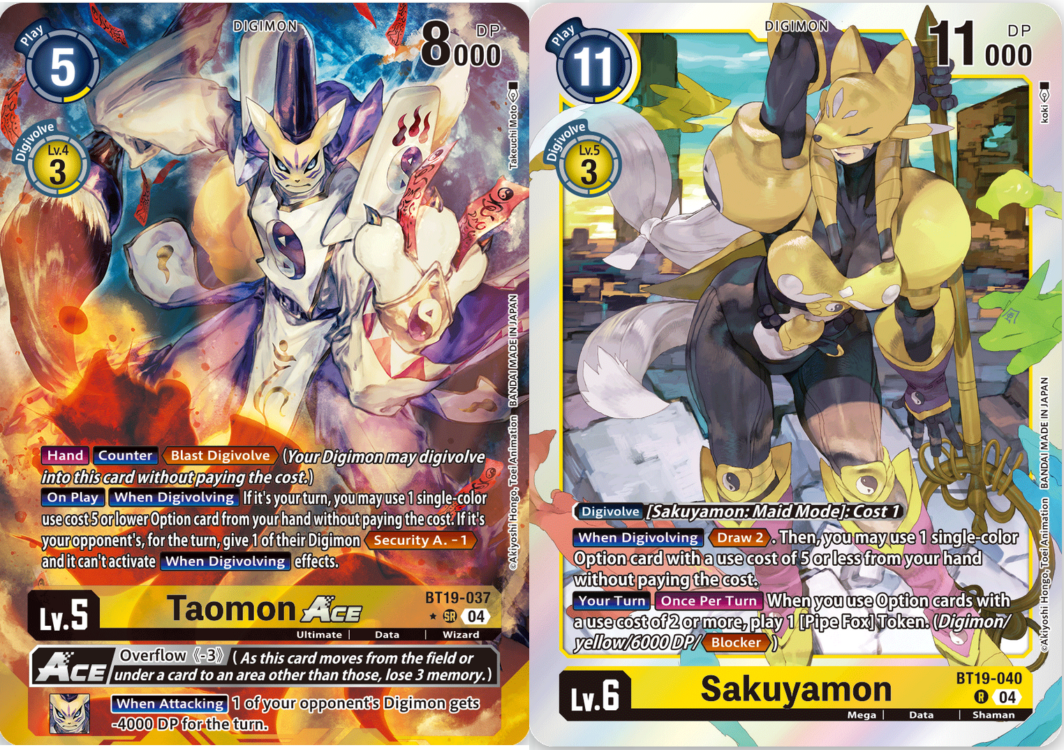 Neues Spielzeug gibt es auch für Sakuyamon Decks und andere witzige Kombinationen. B19-037 Taomon ACE ist eine mächtige Ergänzung für gelbe (und theoretisch auch andere) Decks. Beim Betreten des Feldes lässt es euch eine einfarbige Option Karte mit Kosten bis zu fünf gratis ausspielen (Digitation im eigenen Zug) oder gibt einem gegnerischen Digimon Security Attack -1 und blockiert Digitationseffekte (Digitation im gegnerischen Zug). Als Erbeffekt zieht es bei Angriffen einem gegnerischen Digimon 4000DP ab, was sich gut mit den Effekten von Cendrillmons aus EX7 – Digimon Liberator kombinieren lässt. BT19-040 Sakuyamon lässt euch beim Digitieren zwei Karten ziehen und eine Option Karte mit denselben Bedingungen wie Taomon spielen. Nutzt ihr eine Option Karte mit Kosten von mindestens zwei, spielt es zudem einen Pipe Fox Token aus, welcher Blocker hat. Der gefürchtete Taomon Loop kombiniert dabei diverse Effekte, um eure Gegner:innen in den Wahnsinn zu treiben. Taomon lässt euch eine Option Karte wie EX2 Digivolution Plug-In S nutzen, wodurch ihr kostenlos in EX4 Kuzuhamon digitieren könnt. Dieses lässt euch erneut eine Option Karte mit Kosten bis fünf gratis nutzen und spielt dann ein Taomon aus ihren Digitationskarten aus, wodurch sich Taomon ACE erneut ausspielt. Den Effekt könnt ihr theoretisch so oft nutzen, bis euch die Karten für den Loop ausgehen.