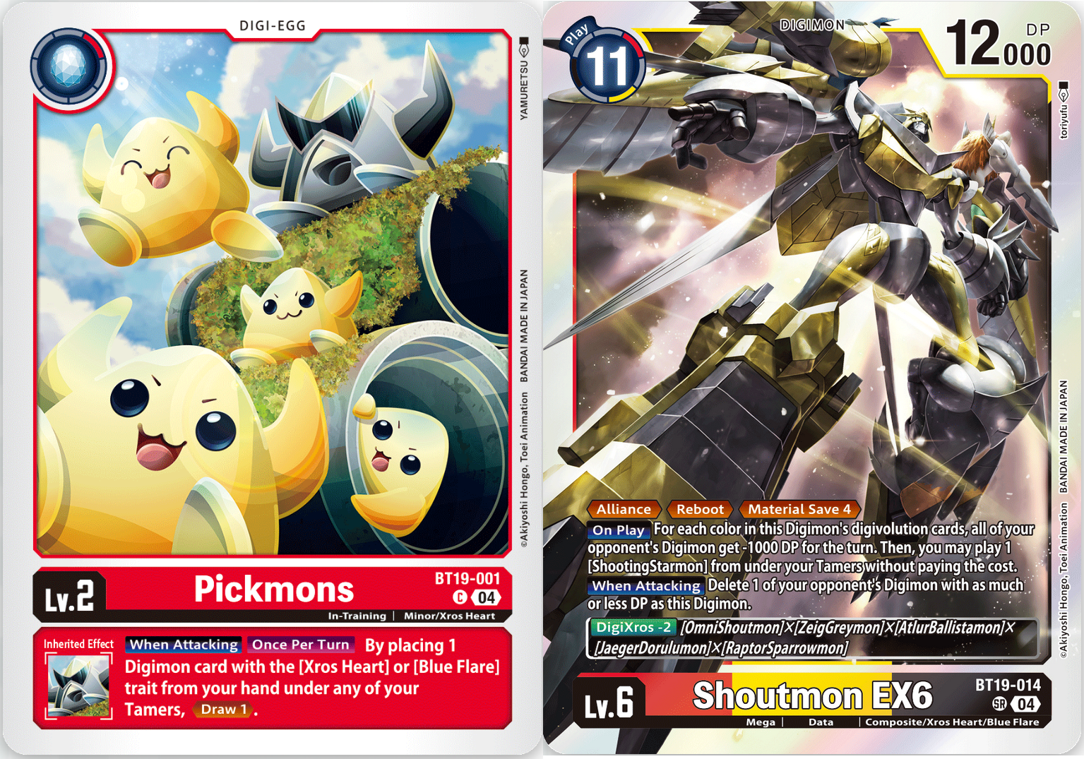 BT19 bringt neuen Support für die zwei Hauptdecks des Digimon Xros Wars Anime und Manga. Xros Heart und Blue Flare. BT19-001 Pickmons ist ein Digiei, welches euch Material für DigiXrosses aufs Feld bringt und euch eine Karte ziehen lässt, was dabei hilft, die fehlenden Draws von Digitationen auszugleichen. BT19-014 Shoutmon EX6 ist ein neues Boss Monster für die Decks. Ihr könnt es entweder für Kosten von elf Memory direkt ausspielen oder über die DigiXros Mechanik für reduzierte Kosten rufen. Dabei reduzieren OmniShoutmon, ZeigGreymon, AtlurBallistamon, JaegerDorulumon und RaptorSparrowmon die Kosten um jeweils zwei Memory. Shoutmon EX6 hat Alliance, Reboot und Material Save 4, zieht beim Ausspielen für jede Farbe in seinen Digitationskarten allen gegnerischen Digimon 1000DP ab und zerstört beim Angreifen ein Digimon mit DP bis zur Höhe seiner eigenen.