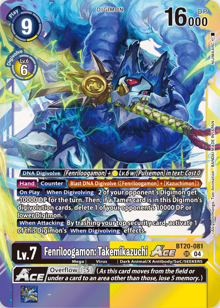 Weil Loogamon Decks noch nicht eklig genug sind, bekommt es direkt wieder Support in Form von einer kompletten Loogamon und Pulsemon Digitationslinie mitsamt BT20-081 Fenriloogamon: Takemikazuchi ACE als neues Top End. Dieses ist ein wahres Biest: Beim Betreten des Feldes zieht es zwei gegnerischen Digimon je 10000DP ab und, wenn ein Tamer in seinen Digitationskarten ist, zerstört ein gegnerisches Digimon bis 10000DP. Beim Angreifen könnt ihr eure oberste Security zerstören, um einen der Digitationseffekte direkt erneut auszulösen. Grundsätzlich ist es als Karte für eure Loogamon Pulsemon Decks konzipiert und kann darin kostenlos über DNA oder Blast DNA gerufen werden. Aber die Effekte sind an sich auch unabhängig davon nutzbar. Die Kosten von sechs oder neun tun zwar weh, aber so könnt ihr die Effekte auch in violetten oder gelben Decks oder farbunabhängig nutzen.