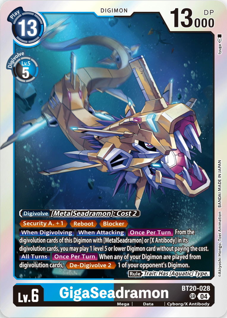 Ein neues Top End gibt es auch für Aquatic Decks. BT20-028 GigaSeadramon ist erstmalig als Karte verfügbar und hat es in sich. Mit Security Attack +1, Reboot und Blocker vereint es Angriff und Verteidigung. Hat es MetalSeadramon oder den X Antibody in seinen Digitationskarten, kann man beim Digitieren und Angreifen ein Digimon bis Level 5 aus seinen Digitationskarten spielen. Werden Digimon aus euren Digitationskarten gespielt, könnt ihr außerdem De-Digivolve 2 auf ein gegnerisches Digimon anwenden und es so schwächen. In Verbindung mit MetalSeadramon ACE habt ihr auch Wege, um es schnell und günstig aufs Feld zu bringen und sein volles Potenzial zu nutzen.