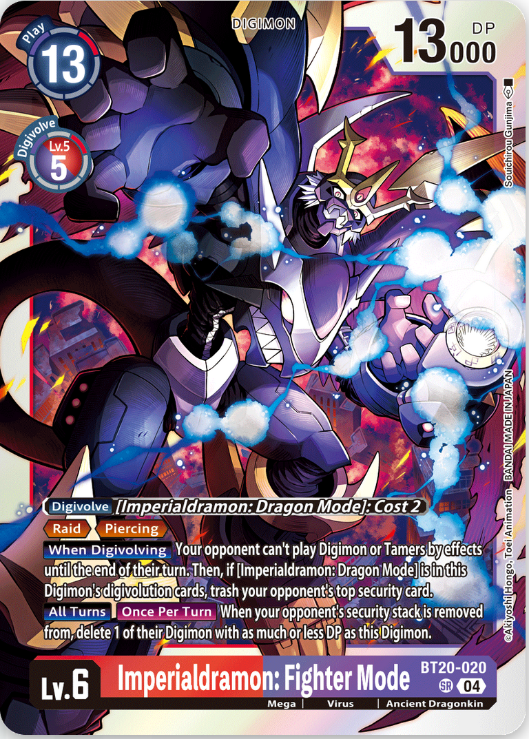 Die Endphase des ersten Arcs von Digimon Liberator bringt neue Karten für rot-violette Versionen von Imperialdramon Decks mit sich. Als Top End gibt es hier zum Beispiel BT20-020 Imperialdramon: Fighter Mode, welches Raid und Piercing hat. Beim Digitieren kann die Gegenseite zudem keine Tamer oder Digimon ausspielen und deren oberste Security wird getrashed, wenn sich Dragon Mode in seinen Digitationskarten befindet. Passiert das, könnt ihr ebenfalls ein Digimon mit DP bis zu Imperialdramon FMs zerstören. Neben dieser Karte gibt es auch die kompletten Reihen von Veemon und Wormmon mit nützlichen Effekten, welche darauf ausgelegt sind, Liberator Decks zu blockieren.