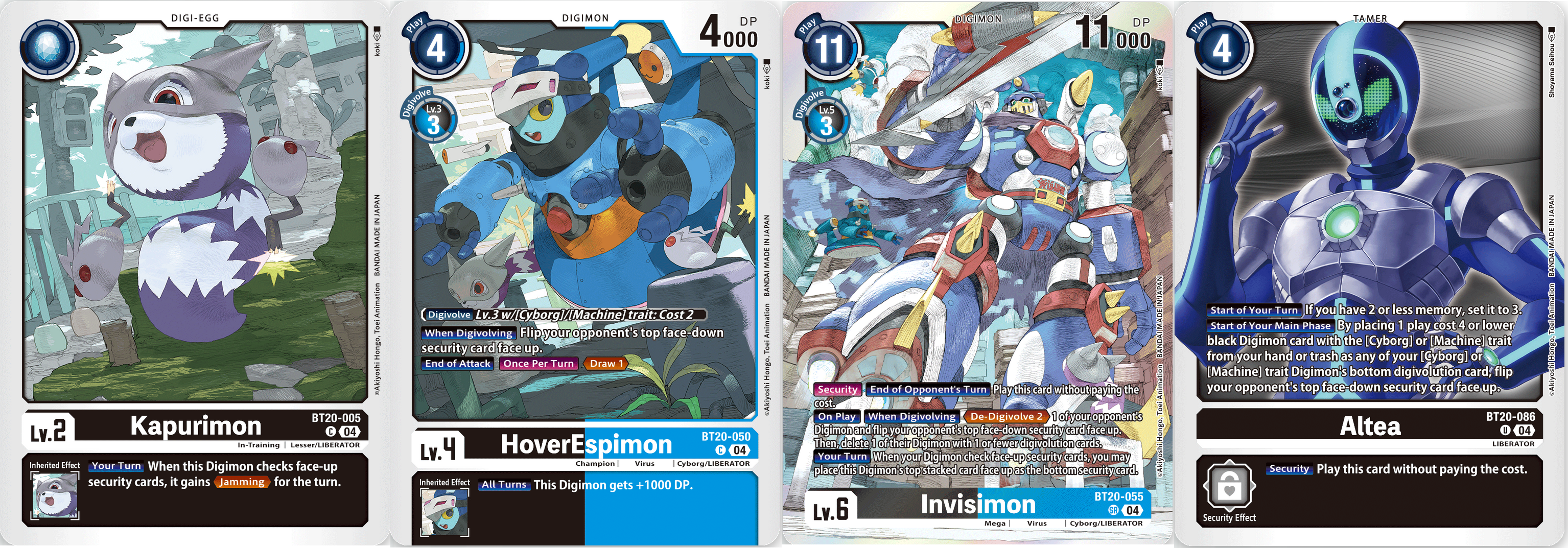 Altea, eine künstliche Intelligenz in Form eines Roboters in der Digimon Liberator Welt, hat Espimon als Partner und schenkt dem Digimon aus Digimon Ghost Game ein eigenes Ultra und Mega Level sowie ein komplett eigenes Deck und einen eigenen Spielstil, welcher mit der Security arbeitet. Das Ei BT20-005 Kapurimon verleiht eurem Digimon Jamming, wenn es aufgedeckte Security Karten checkt. BT20-050 HoverEspimon deckt beim Digitieren die oberste Security der Gegenseite auf und lässt euch am Ende eines Angriffs eine Karte ziehen. Das Top End und neue Mega Level BT20-055 Invisimon spielt sich am Ende des gegnerischen Zuges kostenlos aus der Security aus. Beim Betreten des Feldes löst es De-Digivolve 2 auf ein Digimon aus und deckt die oberste Security auf. Anschließend zerstört es ein gegnerisches Digimon mit einer oder weniger Digitationskarten. Checken eure Digimon offene Security Karten, könnt ihr Invisimon offen unter eure Security legen – somit habt ihr immer wieder einen Weg, um all seine Effekte auszulösen. Zuletzt gibt es noch BT20-086 Altea selbst. Er ist ein Memory Setter und hilft euch dabei, eure aus der Security ausgespielten Digimon mit neuen Digitationskarten von Hand oder Trash auszustatten und dürft dadurch auch die oberste gegnerische Security aufdecken. Spannende Strategie und durch die immer häufiger vorkommenden Feldzauber spielt man dem Deck sogesehen in die Hände.