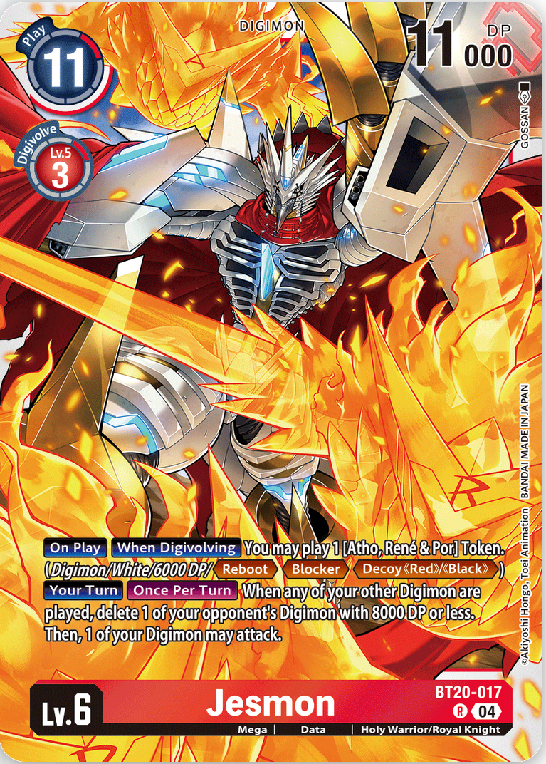 Die Royal Knights und auch das einzeln nutzbare Jesmon Deck bekommen mit BT20 neuen Support. So gibt es beispielsweise das neue BT20-017 Jesmon. Beim Betreten des Feldes spielt es einen Atho, René & Por Token aus. Dieser hat Reboot, Blocker und Decoy für rote und schwarze Digimon. Das wiederum löst Jesmons zweiten Effekt aus, wodurch es ein gegnerisches Digimon bis 8000DP zerstört und eines eurer Digimon angreifen lässt. Es bietet also Schutz und Angriffskraft gleichzeitig.