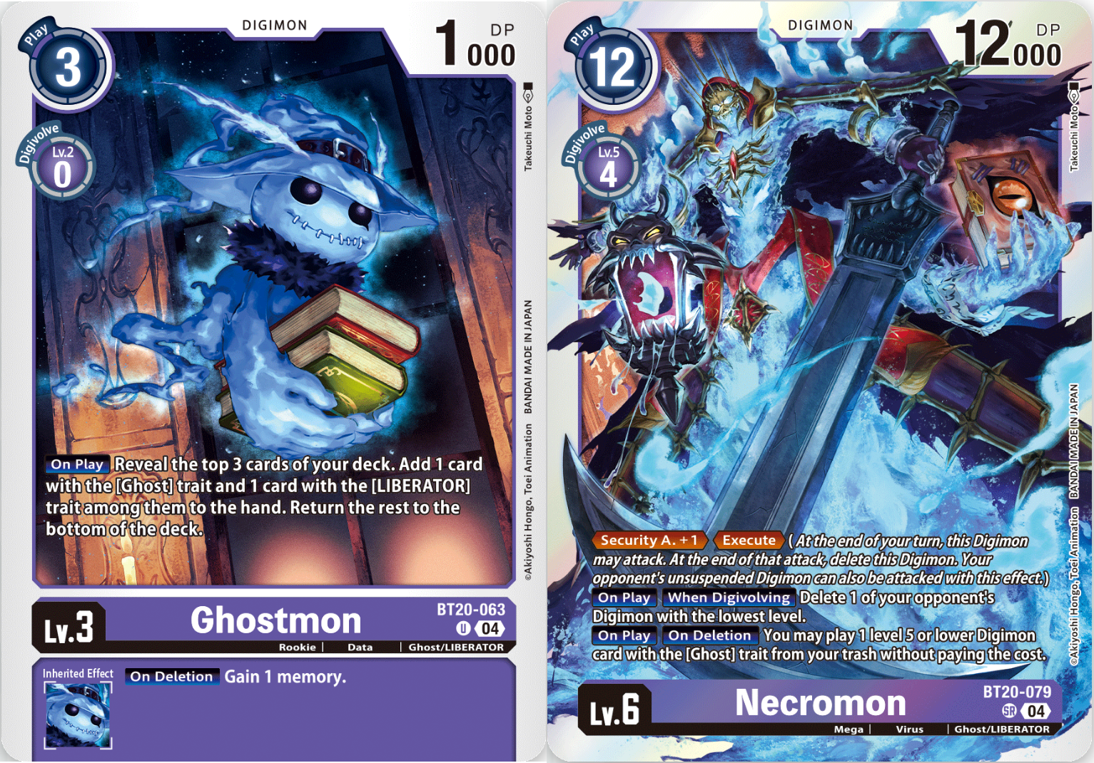 Violet Inboots hat endlich ihre Trumpfkarte enthüllt: BT20-079 Necromon. Der Liberator Comic hat Geist Digimon dadurch ein Mega Level geschenkt, welches auch tatsächlich wie ein Geist aussieht und die Digitationslinie von Ghostmon zu Bakemon und Phantomon abschließt. Wie der Name des neuen Digimon andeutet, arbeitet das Deck mit Nekromantie und alle Karten haben Effekte, die Tod und Wiedergeburt fördern. BT20-063 Ghostmon ist der klassische Liberator Sucher und gibt euch als Erbeffekt bei der Zerstörung ein Memory zurück. Necromon hat Security Attack +1 und den neuen Effekt Execute. Wie auch viele andere Liberator Effekte lässt euch Execute am Ende des Zuges angreifen. Dabei können auch unsuspendete Digimon attackiert werden. Nach dem Angriff wird das Digimon mit Execute zerstört und löst so seine On Deletion Effekte aus. Beim Betreten des Feldes zerstört Necromon zudem ein gegnerisches Digimon mit dem niedrigsten Level und beim Ausspielen und wenn es zerstört wird, könnt ihr ein Geist Digimon bis Level 5 kostenlos aus dem Trash spielen. Somit habt ihr direkt wieder ein starkes Digimon auf dem Feld. Das Deck bräuchte allerdings noch Tools, die euren gespielten Digimon Rush geben und eventuell neue Digitationskarten unter eure gespielten Digimon legen können, wie es Altea im Invisimon Deck macht.