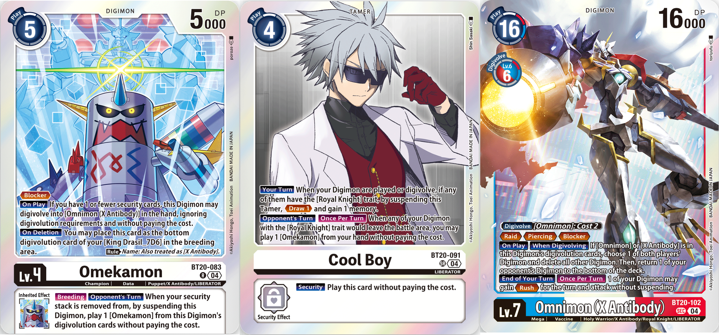 Zuletzt stellen wir euch den coolsten Boy vor. BT20-091 Cool Boy ist ein neuer Tamer für Royal Knight Decks. Spielt oder digitiert ihr Royal Knight Digimon, könnt ihr ihn suspenden, um eine Karte zu ziehen und ein Memory zu bekommen. Das wirkt dem Problem entgegen, dass ihr mehr Digimon ausspielt als digitiert und so weniger oft ziehen könnt und reduziert auch die hohen Digitationskosten. Im gegnerischen Zug könnt ihr außerdem ein Omekamon kostenlos von der Hand spielen, wenn einer eurer Royal Knights das Feld verlassen würde. Sein Partner BT20-083 Omekamon hat Blocker und kann beim Ausspielen kostenlos zu Omnimon X digitieren, wenn ihr maximal eine Security Karte habt. Wird es zerstört, könnt ihr es unter einen King Drasil_7D6 in eurer Breeding Area legen. Von dort spielt es sich als Erbeffekt selbst wieder aus, wenn eine eurer Security Karten im gegnerischen Zug zerstört wird. Das Bossmonster des Decks ist BT20-102 Omnimon X. Es hat Raid, Piercing und Blocker. Befinden sich Omnimon oder der X Antibody (als welcher Omekamon zählt) unter ihm, wenn es das Feld betritt, wählt ihr je ein Digimon auf beiden Seiten aus und zerstört alle anderen. Dann schickt ihr ein gegnerisches Digimon unter deren Deck zurück. Effektiv löscht Omnimon also das ganze Feld aus. Am Ende des Zuges kann es einem Digimon – meist sich selbst – Rush geben und ohne zu suspenden angreifen. Was hier vielleicht spannend zu erwähnen ist, ist dass man Omekamon und Omnimon X auch in Arisas Puppendecks spielen kann. Die Sucher aus ihrem Deck zielen auf Puppen (Omekamon) und Liberator Trait Karten (Omekamon & Omnimon X) ab, wodurch ihr beide suchen könnt. Mit Omekamon bekommt das Deck so einen kleinen Blocker und kann im Endgame auch den Spielfluss zu euren Gunsten drehen, wenn ihr Omekamons On Play Effekt auslösen und kostenlos auf Omnimon X digitieren könnt.