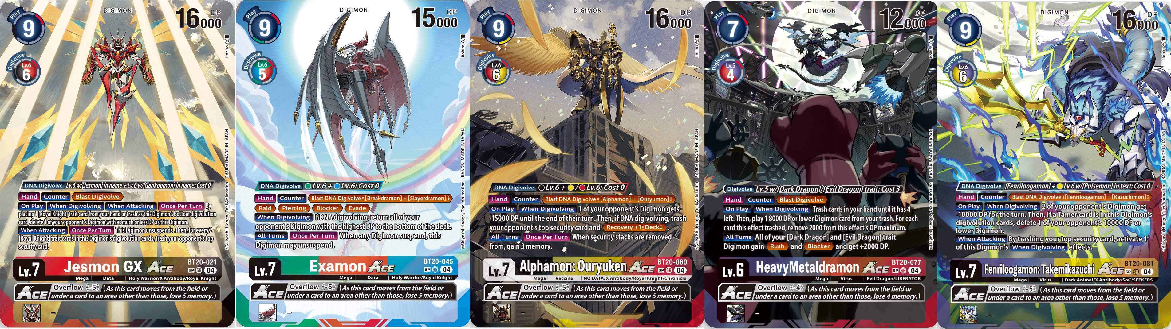 Gleich drei Farben und Farbkombinationen bekommen ein neues Tool und auch allgemein können alle Decks vom mächtigen BT20-060 Alphamon: Ouryuken ACE profitieren. Dieses Monster kommt mit Spielkosten von neun, 16000DP und starken Effekten daher. Schwarze, gelbe und rote Decks können es kostenlos als DNA-Digitation rufen. Für Decks mit Alphamon und Ouryumon gibt es auch die Möglichkeit einer Blast DNA-Digitation. Beim Betreten des Feldes zieht es einem gegnerischen Digimon, unabhängig von der Art des Decks, in dem ihr es spielt, ganze 15000DP ab. Wurde es als DNA-Digitation gerufen, wird zudem eine gegnerische Security getrashed und ihr könnt eine Security recovern. Einmal pro Zug, wenn Securitykarten entfernt werden, bekommt ihr außerdem drei Memory. Bei einer DNA-Beschwörung habt ihr also auf jeden Fall ein Plus an Memory.