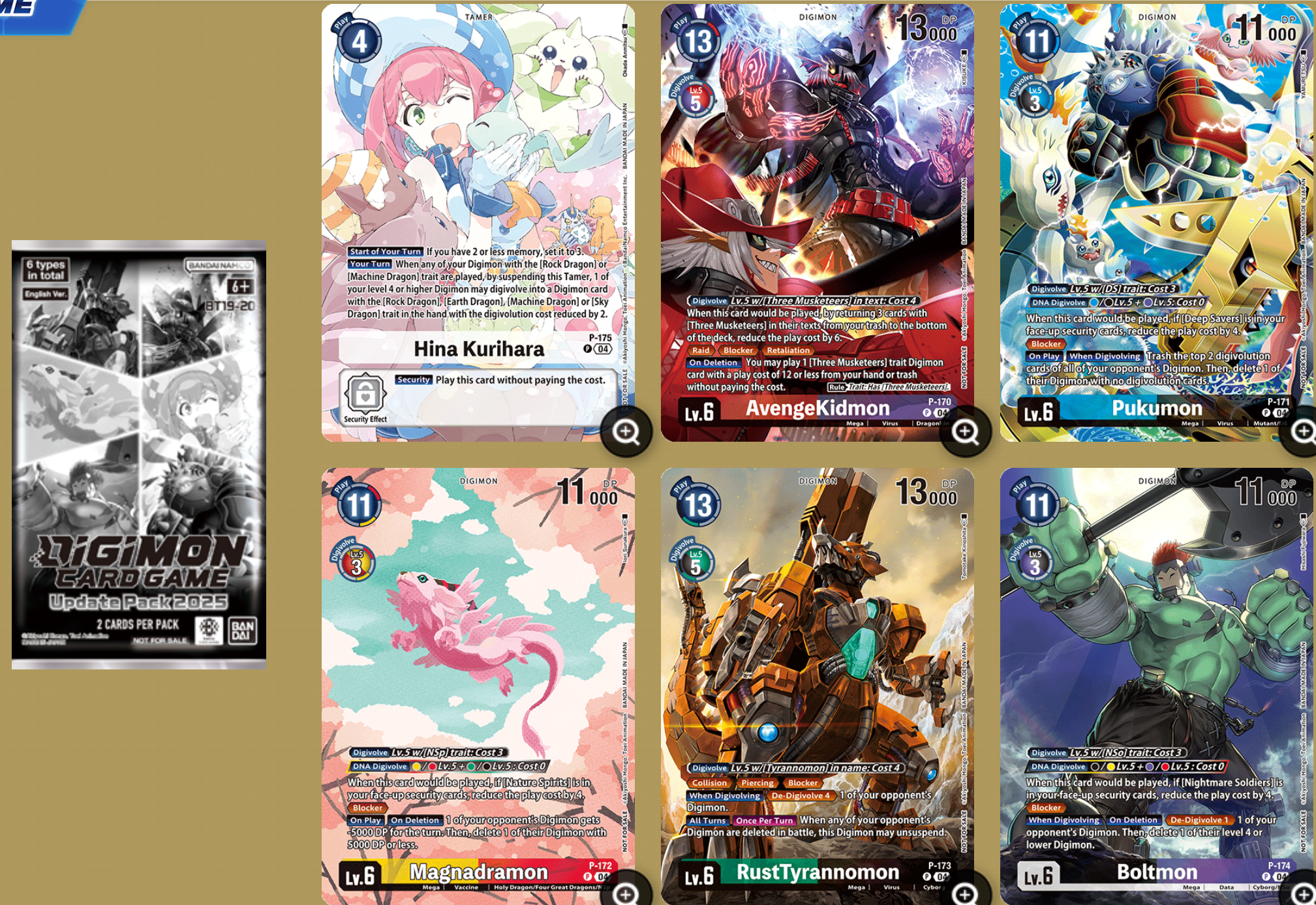 Zusätzlich gibt es ein Update Pack mit zwei aus sechs neuen Promo Karten, die verschiedene Archetypen unterstützen sollen. Dabei handelt es sich um P-170 AvengeKidmon (Three Musketeers), P-171 Pukumon (Deep Savers), P-172 Magnadramon (Nature Spirits), P-173 RustTyrannomon (Tyrannomon / Cyborg), P-174 Boltmon (Nightmare Soldiers) und P-175 Hina Kurihara (Linkz Dragons).