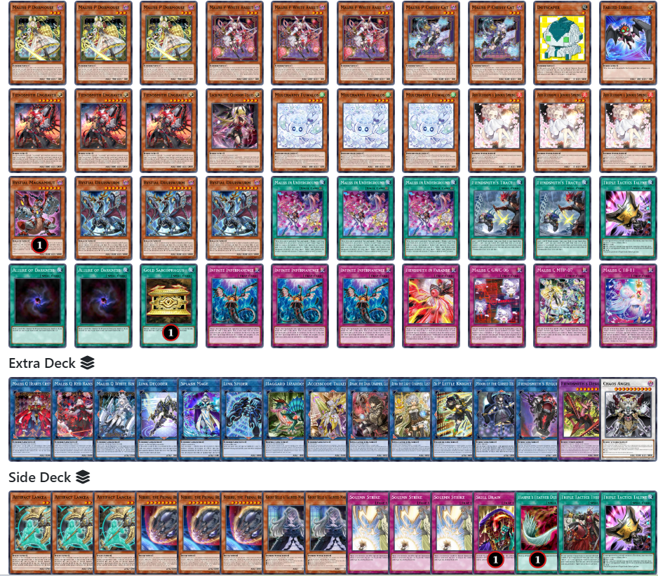 3 Maliss <P> Haselmaus 3 Maliss <P> Weißes Kaninchen 2 Maliss <P> Chessykatze 1 Dotscaper 1 Fabelhafter Lurrie 3 Unterweltlerschmied Graveur 1 Lacrima, die blutroten Tränen 3 Mulreizendes Fuwalos 3 Aschenblüte & Freudiger Frühling 1 Abgeheuerlicher Magnamhut 3 Abgeheuerlicher Druiswurm | 3 Maliss im Untergrund 2 Tract des Unterweltlerschmieds 1 Talent der drei Taktiken 2 Verlockung der Finsternis 1 Gold-Sarkophag | 3 Unendliche Unbeständigkeit 1 Unterweltlerschmied im Paradies 1 Maliss <C> GWC-06 1 Maliss <C> MTP-07 1 Maliss <C> TB-11 | 1 Maliss <Q> Herz-Verschlüsselerin 1 Maliss <Q> Rotes Lösegeld 1 Maliss <Q> Weiße Binderin 1 Link-Dekodierer 1 Schwallmagier 1 Link-Spinne 1 Ausgezehrte Echsendosis 1 Zugangskodier-Sprecher 1 Dharc, der finstere Zauberer in düster 1 Lyna, Lichtverzauberin in strahlend 1 S:P Kleine Ritterin 1 Mond des geschlossenen Himmels 1 Requiem des Unterweltlerschmieds 1 Desirae des Unterweltlerschmieds 1 Chaosengel | 3 Artefakt Longinuslanze 3 Nibiru, das Urwesen 2 Geistermädchen & Spukhaus 3 Feierlicher Schlag 1 Kräfte rauben 1 Harpyien-Flederwisch 1 Stoß der drei Taktiken 1 Talent der drei Taktiken |