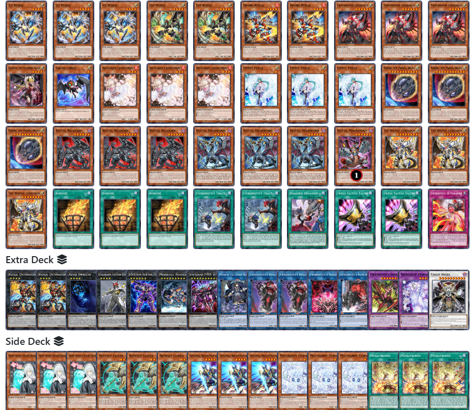 3 Innenmotory-Ryzeal 2 Außenmotor-Ryzeal 2 Schwert-Ryzeal 3 Unterweltlerschmied Graveur 1 Lacrima, die blutroten Tränen 1 Fabelhafter Lurrie 3 Aschenblüte & Freudiger Frühling 3 Effektverschleierin 3 Nibiru, das Urwesen 3 Abgeheuerlicher Baldrachling 3 Abgeheuerlicher Druiswurm 1 Abgeheuerlicher Magnamhut 3 Der abgeheuerliche Lubellion | 3 Leuchtfeuer 2 Tract des Unterweltlerschmieds 1 Markierter Wiedergewinn 2 Talent der drei Taktiken | 1 Unterweltlerschmied im Paradies | 2 Ryzeal-Detonator 1 Abyss-Bewohner 1 Übelschar-Exzitonenritter 1 D/D/D Wellenhochkönig Caesar 1 Mereologischer Sammler 1 Super-Sternenschlächter TY-PHON – Himmelskrise 1 Mond des geschlossenen Himmels 2 Requiem des Unterweltlerschmieds 1 Sequenz des Unterweltlerschmieds 1 Agnumday des Unterweltlerschmieds 1 Desirae des Unterweltlerschmieds 1 Nekrorüst-Prinzessin 1 Chaosengel | 3 Geisterschwester und gruseliger Hartriegel 3 Artefakt Longinuslanze 3 Fantastischer Drache Phantazmei 3 Mulreizendes Fuwalos 3 Metaltronus |