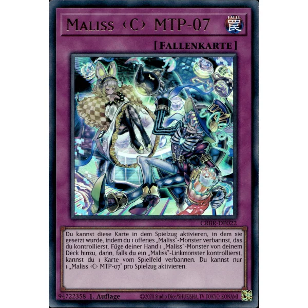 Auch diese Falle könnt ihr im selben Spielzug aktivieren, in dem ihr sie setzt, die Bedingungen hierfür sind dieselben wie oben bereits erwähnt. Mit Maliss <C> MTP-07 sucht ihr euch ein Maliss-Monster vom Deck und verbannt anschließend eine Karte vom Feld, sofern ihr ein Linkmonster kontrolliert. Das kann entweder eine unliebsame gegnerische Karte sein, aber auch eine eigene.