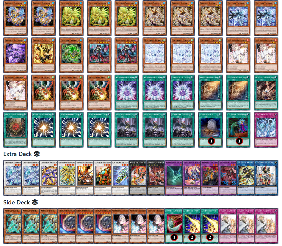 | 2 Kristron Sulfador 3 Kristron Sulfefnir 3 Kristron Smiger 2 Kristron Tristaros 1 Kristron Thystvern 1 Kristron Citree 1 Kristron Prasiöte 2 Diabellstar die schwarze Hexe 3 Mulreizendes Fuwalos 3 Aschenblüte & Freudiger Frühling 3 Kauz & Schlossvogel | 3 Kristron-Einschluss 2 GESUCHT: Sündhafte Beutesucherin 1 Täuschung und die sündhafte Beute 1 Die geheiligte Azamina 3 Superpolymerisation 3 Verbotener Tropfen 1 Törichtes Bebräbnis 1 Vom Grab gerufen | 1 Kristron-Cluster | 2 Kristron Eleskeletus 1 Kristron Ametrix 1 Kristron Quariongandrax 1 Zinnoberfarbener Drachenmech 1 Samurai Zerstörer 1 F.A. Tagesanbruchs-Dragster 1 Cyber Drache Nova 1 Cyber Drache Unendlichkeit 1 Schlammdrache des Sumpfes 1 Garura, Flügel des nachklingenden Lebens 1 Azamina Ilia Silvia 1 Azamina Mu Rcielago 1 S:P Kleine Ritterin 1 Ritter des Uhrwerks | 3 Artefakt Longinuslanze 3 Nibiru, das Urwesen 3 Geisterschwester & Gruseliger Hartriegel 1 Harpyien-Flederwisch 2 Blitzsturm 3 Ernste Warnung |