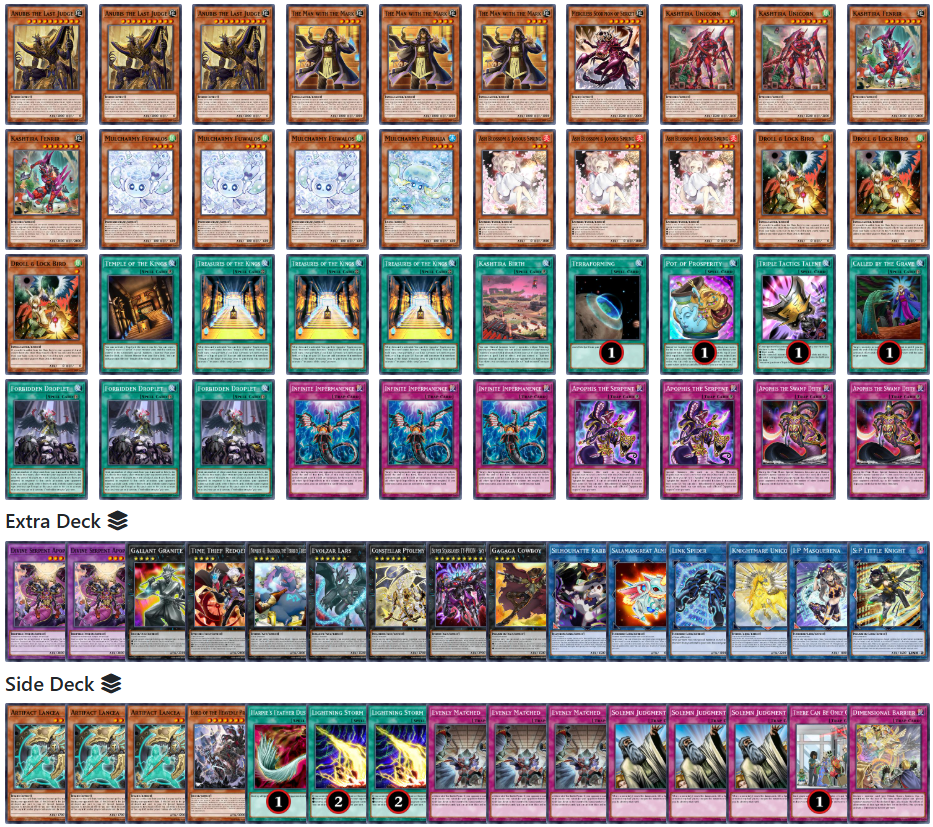 | 3 Mann mit dem Mal 3 Anubis der letzte Richter 1 Unbarmherziger Skorpion von Serket 2 Kashtira Einhorn 2 Kashtira Fenrir 3 Mulreizendes Fuwalos 1 Mulreizende Purulia 3 Aschenblüte & Freudiger Frühling 3 Kauz & Schlossvogel | 1 Tempel der Könige 3 Schätze der Könige 1 Kashtira-Geburt 1 Landformen 1 Topf des Wohlstands 1 Talent der drei Taktiken 1 Vom Grab gerufen 3 Verbotener Tropfen | 3 Unendliche Unbeständigkeit 2 Apophis die Schlange 2 Apophis die Sumpfgottheit | 2 Himmlische Schlange Apophis 1 Tapferer Granit 1 Zeitdieb Wiederholer 1 Nummer 41: Bagooska der schrecklich müde Tapir 1 Evolzar Lars 1 Sternzeichen-Kundler Ptolemy M7 1 Super-Sternenschlächter TY-PHON – Himmelskrise 1 Gagaga Cowboy 1 Silhouhute-Hase 1 Grosalamander Almiraj 1 Link-Spinne 1 Albtraumritter Einhorn 1 I:P Maskerena 1 S:P Kleine Ritterin | 3 Artefakt Longinuslanze 1 Herr des himmlischen Gefängnisses 1 Harpyien-Flederwisch 2 Blitzsturm 3 Ausgeglichener Zweikampf 3 Feierliches Urteil 1 Es kann nur einen geben 1 Dimensionsbarriere |