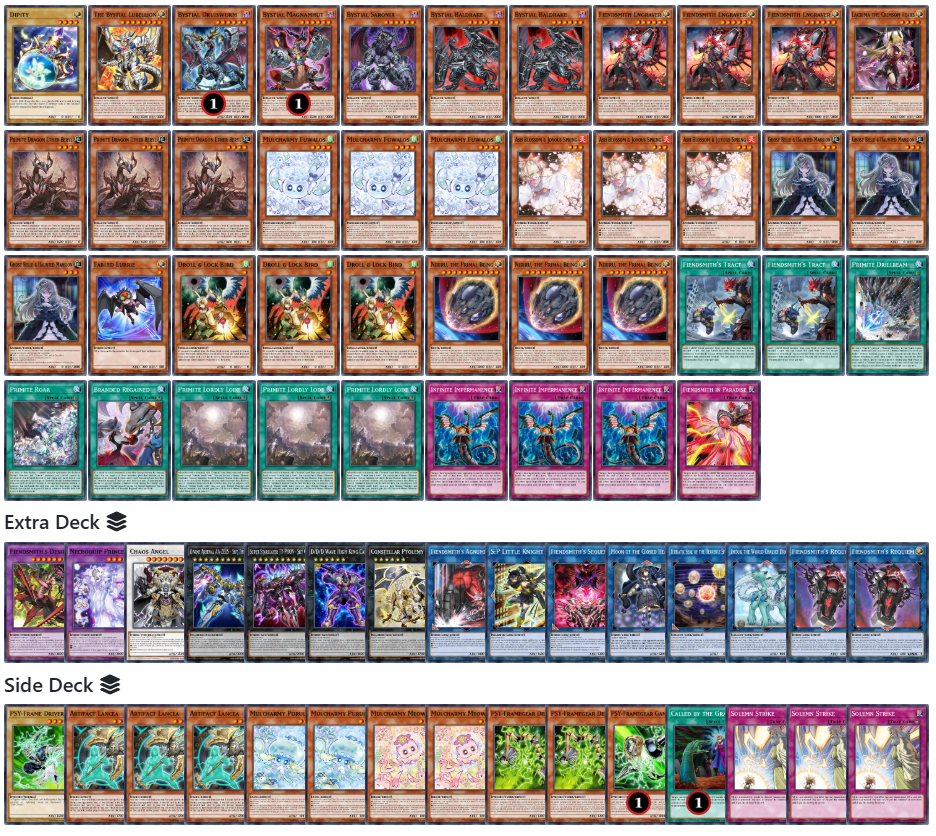 | 1 Dipity 1 Der abgeheuerliche Lubellion 1 Abgeheuerlicher Druiswurm 1 Abgeheuerlicher Magnamhut 1 Abgeheuerlicher Saronir 2 Abgeheuerlicher Baldrachling 3 Unterweltlerschmied Graveur 1 Lacrima, die blutroten Tränen 3 Urerz-Drache Ätherberyll 3 Mulreizendes Fuwalos 3 Aschenblüte & Freudiger Frühling 3 Geistermädchen & Spukhaus 1 Fabelhafter Lurrie 3 Kauz & Schlossvogel 3 Nibiru, das Urwesen | 2 Tract des Unterweltlerschmieds 1 Bohrstrahl des Urerzes 1 Markierter Wiedergewinn 3 Edle Ader des Urerzes | 3 Unendliche Unbeständigkeit 1 Unterweltlerschmied im Paradies | 1 Desirae des Unterweltlerschmieds 1 Nekrorüst-Prinzessin 1 Chaosengel 1 Göttliches Arsenal AA-ZEUS – Himmelsdonner 1 Super-Sternenschlächter TY-PHON – Himmelskrise 1 D/D/D-Wellenhochkönig Caesar 1 Sternzeichen-Kundler Ptolemy M7 1 Agnumday des Unterweltlerschmieds 1 S:P Kleine Ritterin 1 Sequenz des Unterweltlerschmieds 1 Mond des geschlossenen Himmels 1 Priesterliches Siegel der himmlischen Sphären 1 Imduk der Weltkelch-Drache 2 Requiem des Unterweltlerschmieds | 1 PSI-Hüllentreiber 3 Artefakt Longinuslanze 2 Mulreizende Purullia 2 Mulreizende Miauls 2 PSI-Hüllenpanzer Delta 1 PSI-Hüllenpanzer Gamma 1 Vom Grab gerufen 3 Feierlicher Schlag |