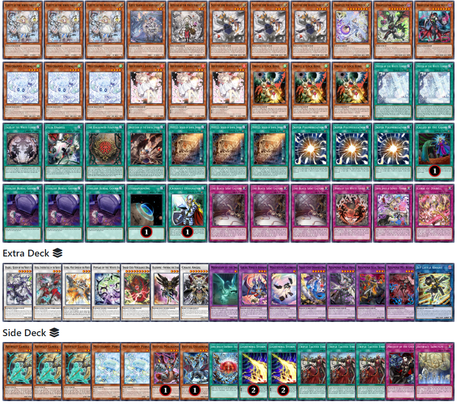 | 3 Elzette vom weißen Wald 1 Elzette, Azamina vom weißen Wald 1 Astellar vom weißen Wald 3 Silvy vom weißen Wald 1 Diabellze die weiße Hexe 1 Diabellstar Rache 1 Diabellstar die schwarze Hexe 3 Mulreizendes Fuwalos 3 Aschenblüte & Freudiger Frühling 3 Kauz & Schlossvogel | 2 Hexe vom weißen Wald 1 Geschichten vom weißen Wald 1 Filia Diabell 1 Die geheiligte Azamina 1 Täuschung und die sündhafte Beute 3 GESUCHT: Sündhafte Beutesucherin 3 Superpolymerisation 1 Vom Grab gerufen 3 Törichte Begräbnisbeigaben 1 Landformen 1 Auslöschungsinformant | 3 Die schwarze Ziege lacht 1 Leiden vom weißen Wald 1 Diabells Fluch | 1 Diabell, Königin vom weißen Wald 1 Rciela, Unheimliche Seele vom weißen Wald 1 Silvera, Wolfszähne vom weißen Wald 1 Pappel vom weißen Wald 1 Schlangenauge Rachedrache 1 Schwarzflügel – Nothung das Sternenlicht 1 Chaosengel 1 Schlammdrache des Sumpfes 1 Garura, Flügel des nachklingenden Lebens 1 Magistus Chorizo 1 Schlangenauge verdammter Drache 1 Azamina Moa Regina 1 Azamina Ilia Silvia 1 Azamina Mu Rcielago 1 S:P Kleine Ritterin | 3 Artefakt Longinuslanze 2 Mulreizende Purulia 1 Abgeheuerlicher Magnamhut 1 Abgeheuerlicher Druiswurm 1 Sündhafte Beute des Verrats – Schlangenauge 2 Blitzsturm 3 Stoß der drei Taktiken 1 Übermut der Gnome 1 Artefakt Heiligtum |