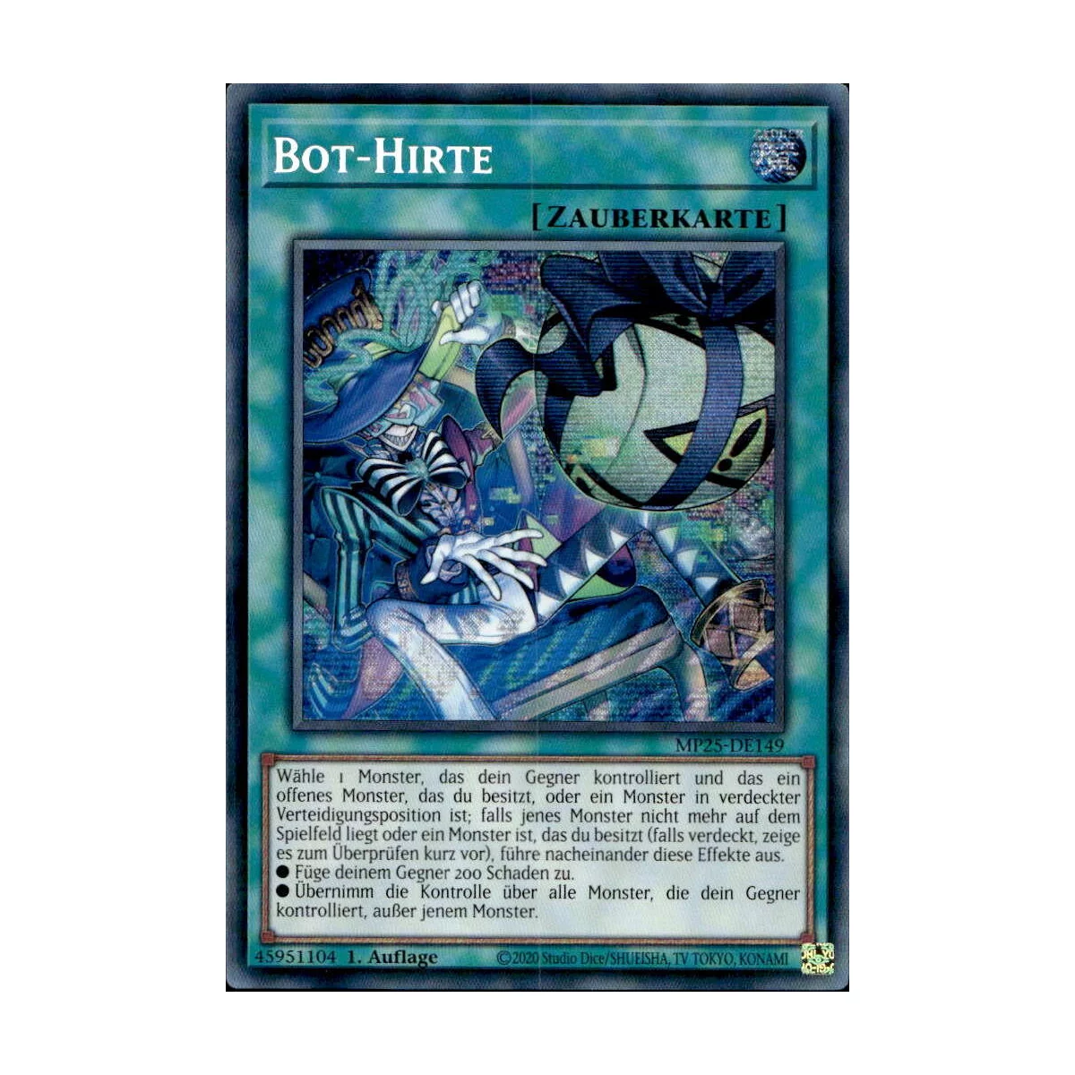 Zunächst müsst ihr ein gegnerisches Monster wählen. Dabei darf es sich aber nur um ein verdecktes Monster handeln oder um ein Monster, das eigentlich euch gehört (also Lava Golem, Kaijus usw.). Wenn dieses Monster dann nicht mehr auf dem Spielfeld liegt, weil es zerstört wurde oder als Material verwendet wurde oder wie auch immer, könnt ihr zwei Effekte ausführen: Zum einen nimmt der Gegner 200 Punkte Schaden, zum anderen übernehmt ihr die Kontrolle über alle gegnerischen Monster bis auf das Monster, das ihr mit Bot-Hirte angewählt habt. War das jetzt so richtig? Ich weiß es wirklich nicht, aber das Wording ist hier auch einfach irgendwie wirr.