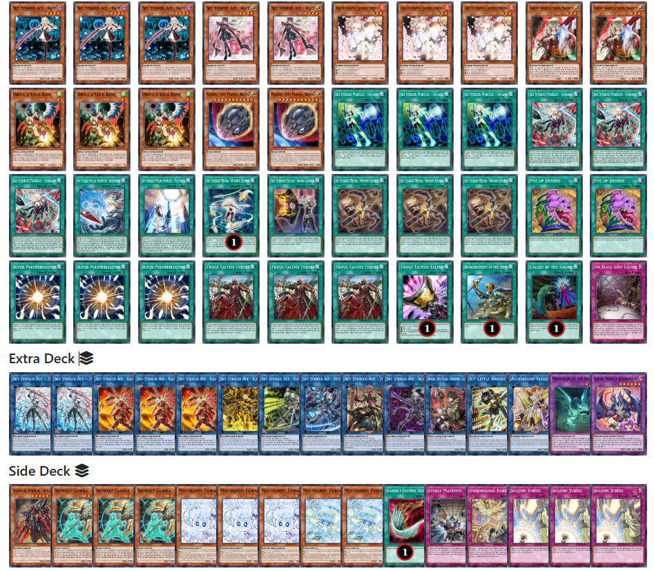 3 Himmelsjäger-Ass – Raye 2 Himmelsjäger-Ass – Roze 3 Aschenblüte & Freudiger Frühling 2 Geisteroger und Schneehase 3 Kauz & Schlossvogel 2 Nibiru, das Urwesen | 3 Himmelsjäger-Mobilisierung – Angriff! 3 Himmelsjäger-Mobilisierung – Verbindung! 1 Himmelsjäger-Spezialmanöver – Lemnisgate! 1 Himmelsjäger-Mechmodule – Mehrzweck 1 Himmelsjäger-Mech – Hornissendrohnen 1 Himmelsjäger-Mech – Haikanone 3 Himmelsjäger-Mech – Witwenanker 2 Topf der Begierden 3 Superpolymerisation 3 Stoß der drei Taktiken 1 Talent der drei Taktiken 1 Verstärkung für die Armee 1 Vom Grab gerufen | 1 Die schwarze Ziege lacht | 2 Himmelsjäger-Ass = Zero 3 Himmelsjäger-Ass – Kagari 1 Himmelsjäger-Ass – Kaina 1 Himmelsjäger-Ass – Hayate 1 Himmelsjäger-Ass – Shizuku 1 Himmelsjäger-Ass – Zeke 1 Himmelsjäger-Ass – Azalea 1 Dharc, der finstere Zauberer in düster 1 S:P Kleine Ritterin 1 Zugangskodier-Sprecher 1 Schlammdrache des Sumpfes 1 Garura, Flügel des nachklingenden Lebens | 1 Chirurgischer Jäger – H.A.M.P. 3 Artefakt Longinuslanze 3 Mulreizendes Fuwalos 2 Mulreizende Purulia 1 Harpyien-Flederwisch 1 Ausgeglichener Zweikampf 1 Dimensionsbarriere 3 Feierlicher Schlag |
