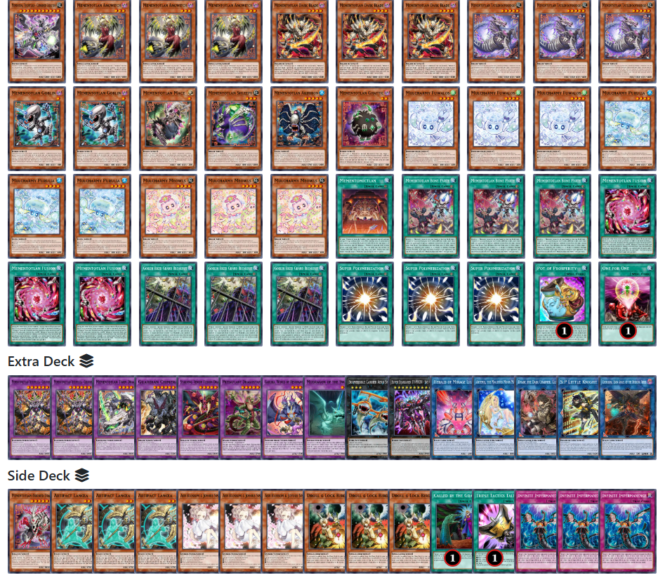 1 Mementoal Tecuhtlica – Kombinierte Schöpfung 3 Mementotlanische Enghexe 3 Mementotlanische Dunkelklinge 3 Mementotlanischer Tatsunootoshigo 1 Mementotlanischer Stab 1 Mementotlanisches Schlafschaf 1 Mementotlanischer Akihiron 1 Mementotlanischer Dachbodengeist 3 Mulreizendes Fuwalos 3 Mulreizende Purulia 3 Mulreizendes Miauls | 1 Mementomictlan 3 Mementotlanische Knochenparty 3 Mementotlanische Fusion 3 Großer Ausbruch der Goblin-Biker 3 Superpolymerisation 1 Topf des Wohlstands 1 Einer für einen | – | 2 Mementotmiclan Tecuhtlica – Schöpfungskönig 1 Mementotlanischer Zwillingsdrache 1 Wächter-Schimäre 1 Hungergift-Fusionsdrache 1 Raubpflanze Drachostapelia 1 Garura, Flügel des nachklingenden Lebens 1 Schlammdrache des Sumpfes 1 Tauchfähiger Aero-Hai-Träger 1 Super-Sternenschlächter TY-PHON – Himmelskrise 1 Herold des trügerischen Lichts 1 Artemis, Magistus-Mondmaid 1 Dharc, der finstere Zauberer in düster 1 S:P Kleine Ritterin 1 Cherubini, schwarzer Engel des Brennenden Abgrunds | 1 Mementotlanisch-Hörniger Drache 3 Artefakt Longinuslanze 3 Aschenblüte & Freudiger Frühling 3 Kauz & Schlossvogel 1 Vom Grab gerufen 1 Talent der drei Taktiken 3 Unendliche Unbeständigkeit |