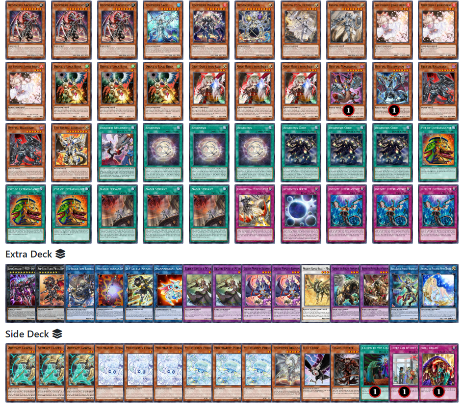 3 Regenesis-Erzunterweltler 1 Regenesis-Weiser 1 Regenesis-Krieger 1 Regenesis-Herrscher 1 Dogmarika Ecclesia, die Tugendhafte 1 Dogmatika Fleurdelis, die Ritterliche 3 Aschenblüte & Freudiger Frühling 3 Kauz & Schlossvogel 3 Geisteroger und Schneehase 1 Abgeheuerlicher Magnamhut 1 Abgeheuerlicher Druiswurm 2 Abgeheuerlicher Baldrachling 1 Der abgeheuerliche Lubellion | 1 Markierter Wiedergewinn 3 Regenesis 3 Regenesis-Code 3 Topf der Extravaganz 3 Nadir-Diener | 1 Dogmatika-Bestrafung 1 Regensis-Geburt 3 Unendliche Unbeständigkeit | 1 Super-Sternenschlächter TY-PHON – Himmelskrise 1 Rotäugiger Leuchtfeuer-Metalldrache 1 Sta-Brigade-Waffen Bucephalus II 1 Weltzahnräder des theurlogischen Demiurgen 1 S:P Kleine Ritterin 1 Grosalamander Almiraj 2 Ältestes Wesen N‘Tss 2 Garura, Flügel des nachklingenden Lebens 1 Goldenes Wolkenungeheuer – Malong 1 Schimäre der König der Phantomungeheuer 1 Berfomet der mythische König der Phantomungeheuer 1 Schwarz glänzender Soldat – Soldat des Chaos 1 Artemis, Magistus-Mondmaid | 3 Artefakt Longinuslanze 3 Mulreizendes Fuwalos 3 Mulreizende Purulia 1 1 Regenesis Dragon 1 D.D. Krähe 1 Chaosjägerin 1 Vom Grab gerufen 1 Es kann nur einen geben 1 Kräfte rauben |
