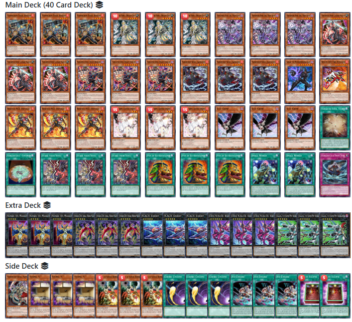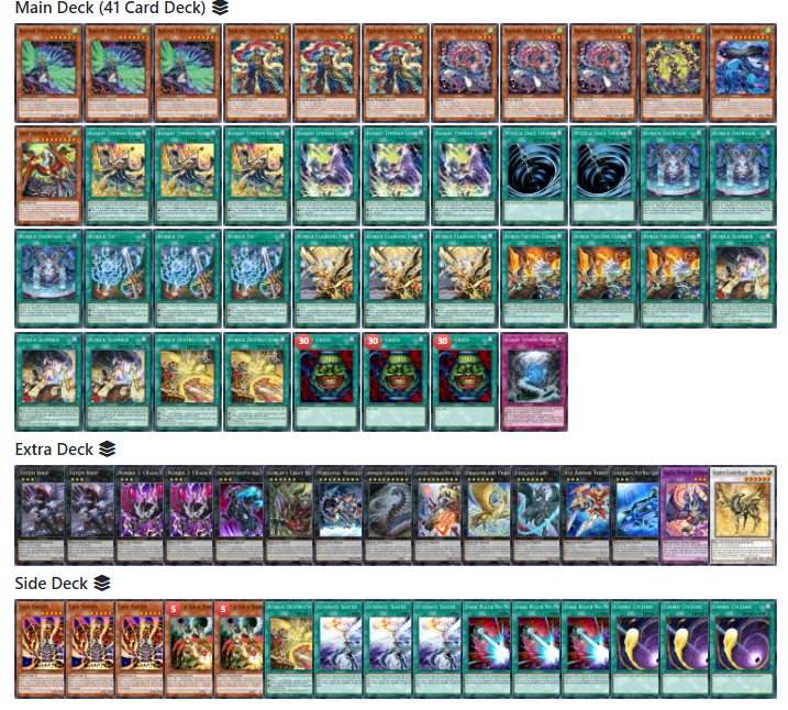 3 Glanztaifun Krosea 3 Glanztaifun Swen 3 Glanztaifun Eldam 1 Glanztaifun Meghala 1 Glanztaifun Varuroon, der pulsierende Strudel 1 Glanztaifun Fonix, die große Flamme | 3 Glanztaifun-Vision 3 Glanztaifun-Gesang 2 Mystischer Raum-Taifun 3 Runischer Brunnen 3 Runische Spitze 3 Runisches aufblitzendes Feuer 3 Runische frostige Flüche 3 Runischer Schlummer 2 Runische Zerstörung 3 Topf der Gier | 1 Glanztaifun-Auftrag | 3 Totemvogel 2 Nummer 3: Zikadenkönig 1 Die Phantomritter des zerbrochenen Schwerts 1 Verrücktes Ungeheuer der Goblins 1 Mereologischer Sammler 1 Jormungandr, Generaider-Boss der Ewigkeit 1 Laevatein, Generaider-Boss der Schatten 1 Drachenlerche Pairen 1 Evolzar Lars 1 Xyz-Panzerungstorpedo 1 Superquantal Mechungeheuer Grampulse 1 Garura, Flügel des nachklingenden Lebens 1 Goldenes Wolkenungeheuer – Malong | 3 Lava-Golem 2 Kauz & Schlossvogel 1 Runische Zerstörung 3 Ultimativer Schlächter 3 Kein Dunkler Herrscher mehr 3 Kosmoszyklon |