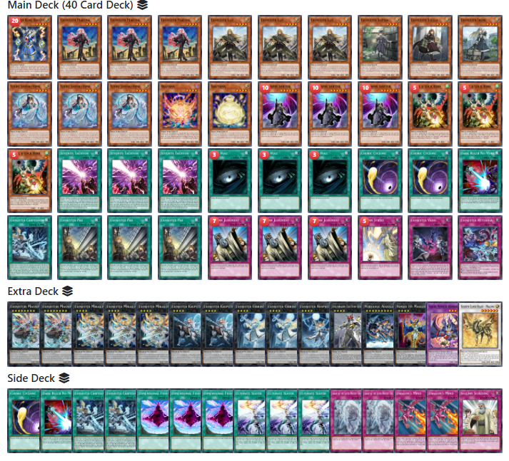 1 Donnerkönig Rai-Oh 3 Exoschwester Martha 3 Exoschwerster Elis 1 Exoschwester Sophia 1 Exoschwester Stella 1 Exoschwester Irene 3 Ichiki Sayori-Hime 1 Aratama 1 Sakitama 3 Dimensionsverschieber 3 Kauz & Schlossvogel | 3 Siebentes Tachyon 3 Schwarzes Loch 2 Kosmoszyklon 1 Kein Dunkler Herrscher mehr 1 Exoschwerster-Carpedivem 3 Exoschwester-Pax | 3 Feierliches Urteil 1 Feierlicher Schlag 1 Exoschwester-Vadis 1 Exoschwester-Rückanei | 2 Exoschwester Magnifica 3 Exoschwester Mikailis 2 Exoschwerster Kaspitell 3 Exoschwester Gibrine 1 Übelschar-Exzitonenritter 1 Mereologischer Sammler 1 Nummer 104: Maskerade 1 Garura, Flügel des nachklingenden Lebens 1 Goldenes Wolkenungeheuer – Malong | 1 Kosmoszyklon 1 Kein Dunkler Herrscher mehr 2 Exoschwester-Carpedivem 3 Dimensionsriss 3 Ultimativer Schlächter 2 Grab des Superantiken Organismus 2 Drachengedanken 1 Ernste Predigt |