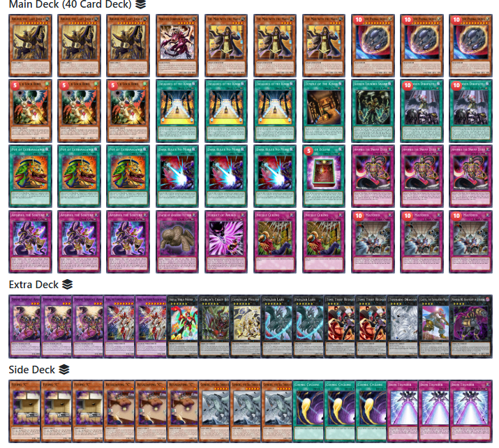 3 Anubis der letzte Richter 1 Unbarmherziger Skorpion von Serket 3 Der Mann mit dem Mal 3 Nibiru, das Urwesen 3 Kauz & Schlossvogel | 3 Schätze der Könige 1 Tempel der Könige 1 Sudden Thunder Swamp 2 Verbotener Tropfen 3 Topf der Extravaganz 3 Kein Dunkler Herrscher mehr 1 Buch der Verfinsterung | 3 Apophis die Sumpfgottheit 3 Apophis die Schlange 1 Statue der Schmerzmuster 1 Verdikt von Anubis 2 Nageldecke 3 Ausgeglichener Zweikampf | 3 Himmlische Schlange Apophis 2 Nerva die Machtpatronin der Schöpfung 1 Phönix der Virtualwelt – Fanfan 1 Verrücktes Ungeheuer der Goblins 1 Sternzeichen-Kundler Ptolemy M7 2 Evolzar Lars 2 Zeitdieb Wiederholer 1 Tornado-Drache 1 Castel, der Himmelssprenger-Musketier 1 Nummer 80: Rhapsodie im Berserkern | 3 Fliegendes „C“ 3 Vergeltendes „C“ 3 Gameciel, der Kaiju der Meeresschildkröte 3 Kosmoszyklon 3 Eisendonner |
