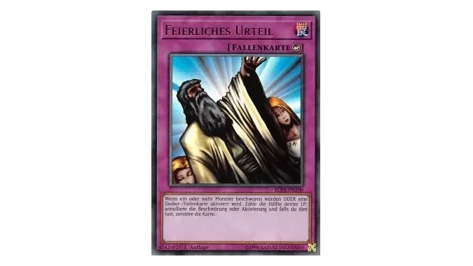Alter, weißer Mann sagt nein. Damit ist Feierliches Urteil eigentlich hinreichend beschrieben. Warum diese Karte aber nun limitiert werden musste, verstehe ich nicht so wirklich. Ich meine, ja, Feierliches Urteil annulliert fast alles, aber ist als Fallenkarte auch recht langsam. Außerdem annulliert diese Karte die Beschwörung bzw. Aktivierung und nicht nur den Effekt, was bedeutet, dass ihr die Karte, die ihr spielen wolltet, erneut aktivieren könnt (sofern ihr Zugriff auf eine weitere Kopie habt, natürlich). Als Side Deck Option ist Feierliches Urteil eine gute Wahl, sonst aber doch eher ein randständiger Vertreter in der Meta.